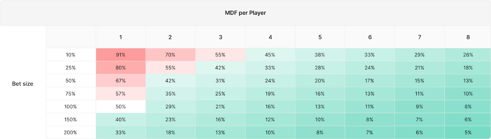 В следующей таблице показана защита, частота которой в среднем необходимая каждому игроку для соответствия MDF (минимальной частоте защиты):