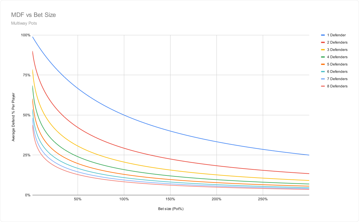 На практике игрок, завершающий действие, берет на себя бОльшую часть защиты, чем игроки до него. Это связано с тем, что у игрока, который закрывает действие, более выгодная защита, поскольку он не рискует быть вытесненным с этой улицы. Однако мы можем использовать приведенное выше упрощенное уравнение, чтобы продемонстрировать стратегические различия в мультипотах.