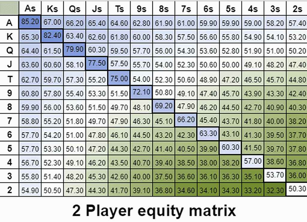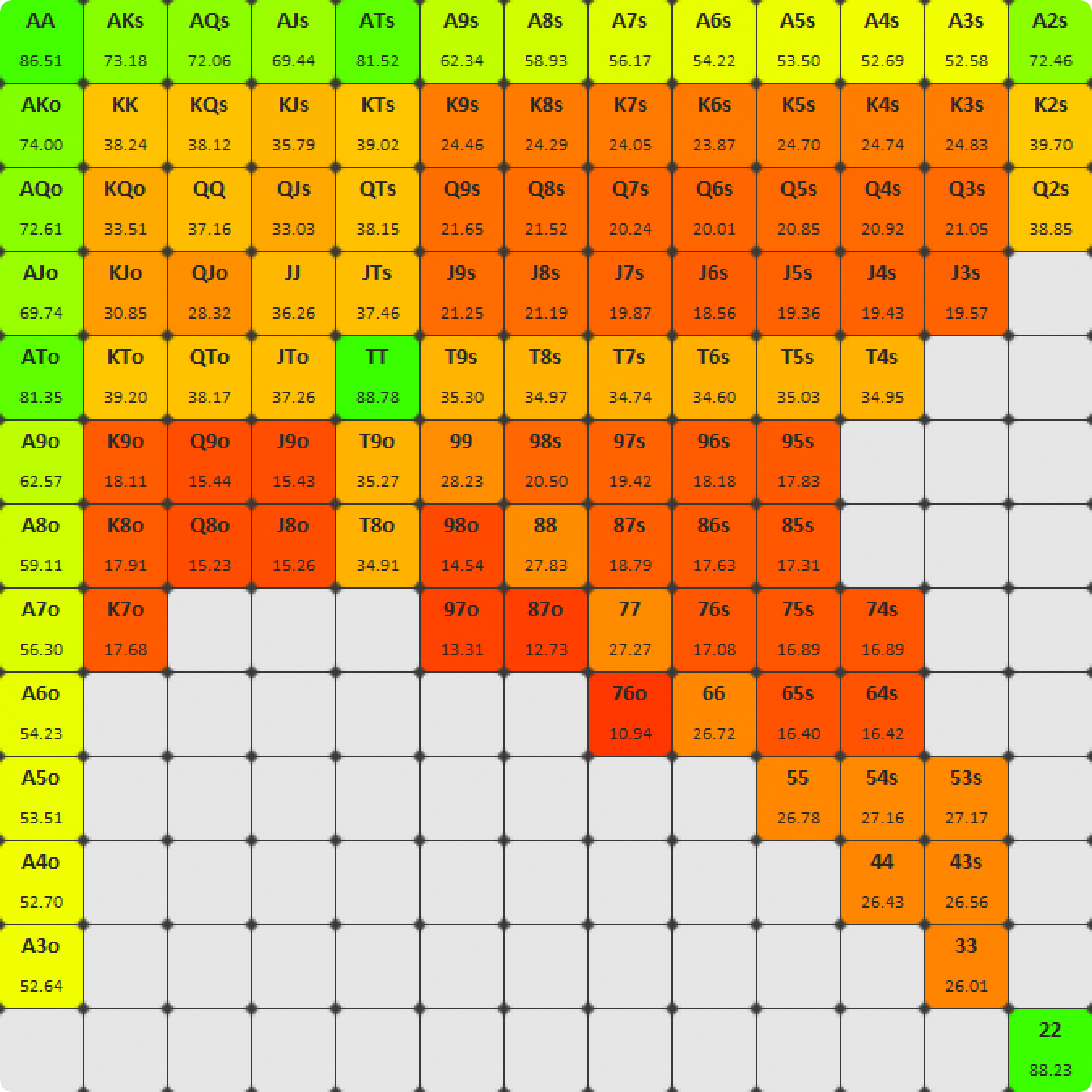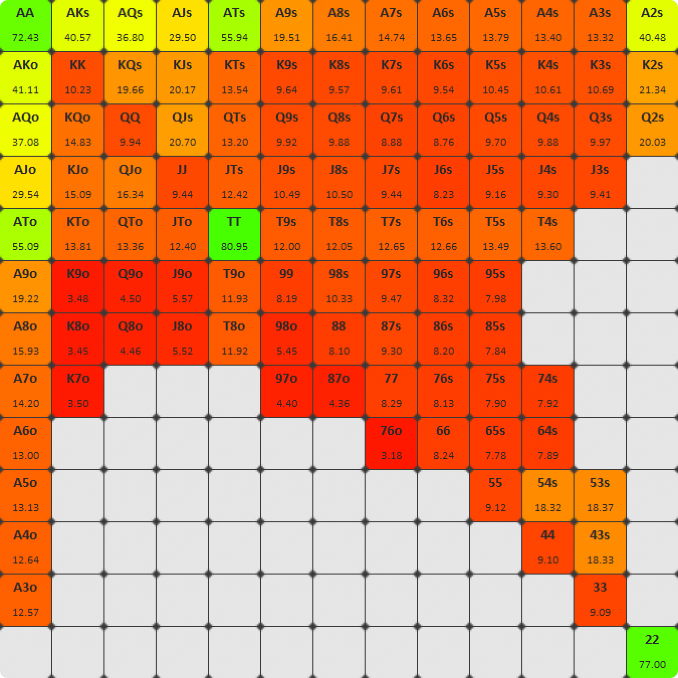 Точные цифры не важны. Вместо этого обратите внимание на цветовой градиент. Мультипоты увеличивают предполагаемые и обратно предполагаемые шансы. Эффект аналогичен тому, как предполагаемые шансы увеличиваются в банках с глубокими стеками. Более узкие пороги для выставлений в мультипотах означают, что вам нужны более сильные руки, чтобы пойти олл-ин на вэлью, чем в хедз-ап потах. Статические блеф-кетчеры, средние руки, которым будет трудно улучшиться, даже некоторые топ-пары теряют тут очень много эквити. Руки, которые хорошо справляются с мультипотами, имеют больше возможностей для натса. Способность вашей руки улучшиться до чего-то очень натсового имеет гораздо большее значение.