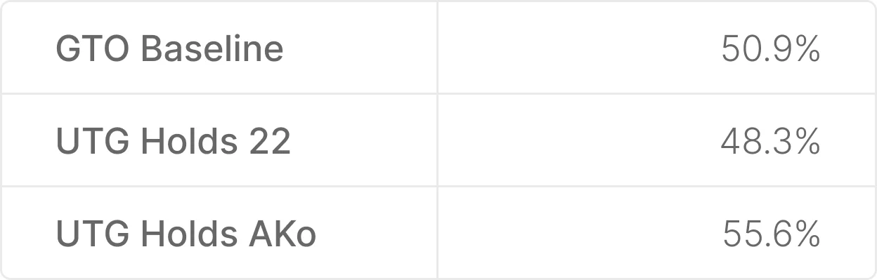 Это довольно существенная разница. При открытии с UTG AK рассчитывает украсть блайнды на 7,3% чаще, чем 22! Это связано с тем, что AK блокирует руки, которые коллируют или повышают опен-рейз UTG, в то время как 22 в основном блокирует руки, которые фолдят. Та же концепция распространяется и на постфлоп. Блокирование натса значит гораздо больше, это значительно усложняет получение денег с помощью ваших велью рук. Блокирование пустых рук более проблематично для вашего собственного блефа.