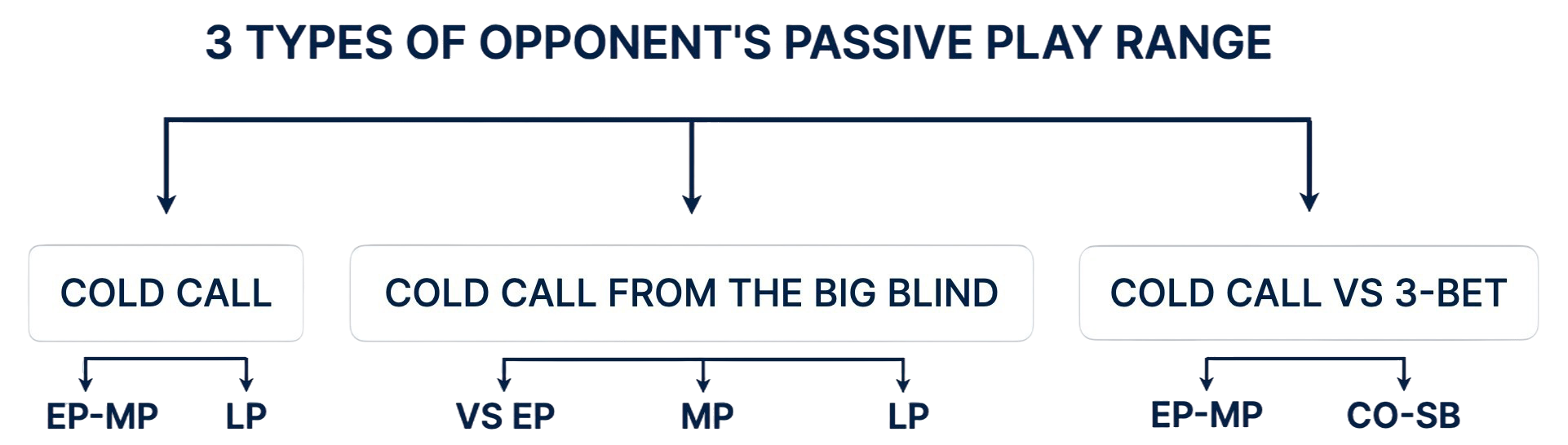 Диапазон оппонента может сильно отличаться в разных игровых ситуациях и, его наполнение влияет на количество фолд эквити даже в рамках одного и тоже флопа в разных ситуациях. Условно можно разделить все диапазоны пассивной игры оппонента на 3 типа.