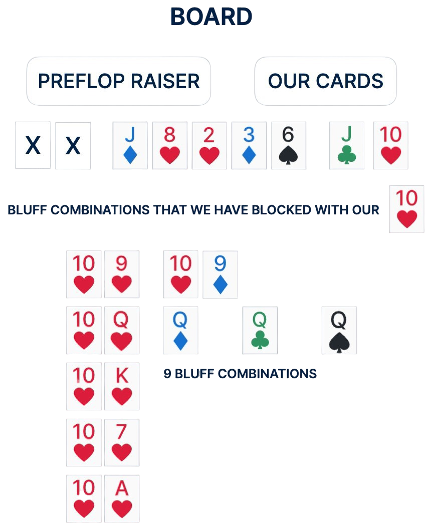 При блефе против сильного оппонента фактор блокеров имеет большое значение, поскольку блеф без блокеров может увести линию розыгрыша в минус.