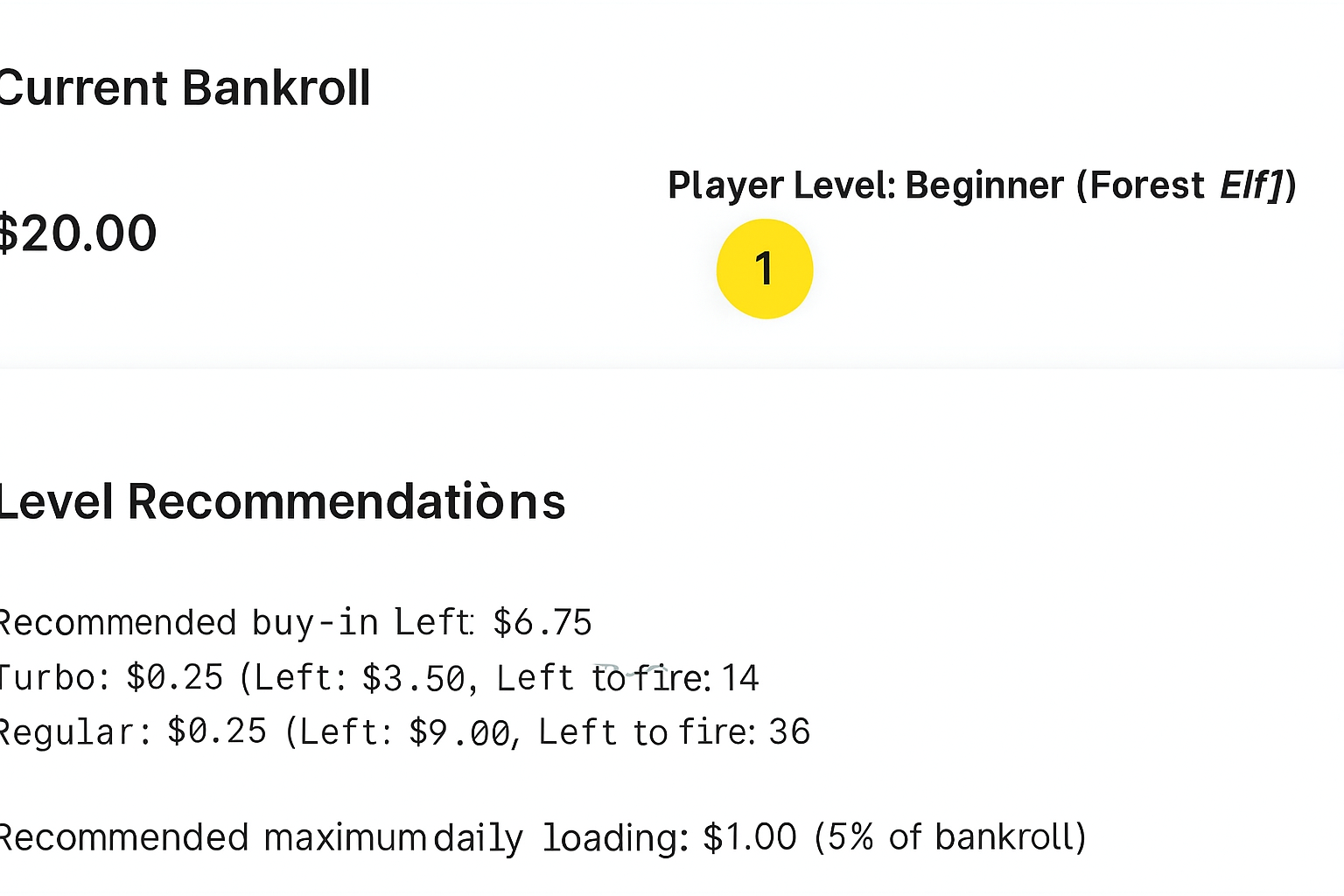 - Уровень игрока: Калькулятор сразу присвоит вам уровень (например, «Новичок – Лесной эльф»), в зависимости от суммы банкролла. С ростом банкролла уровень игрока будет повышаться, что добавляет элемент геймификации и стимулирует двигаться к более высоким показателям.