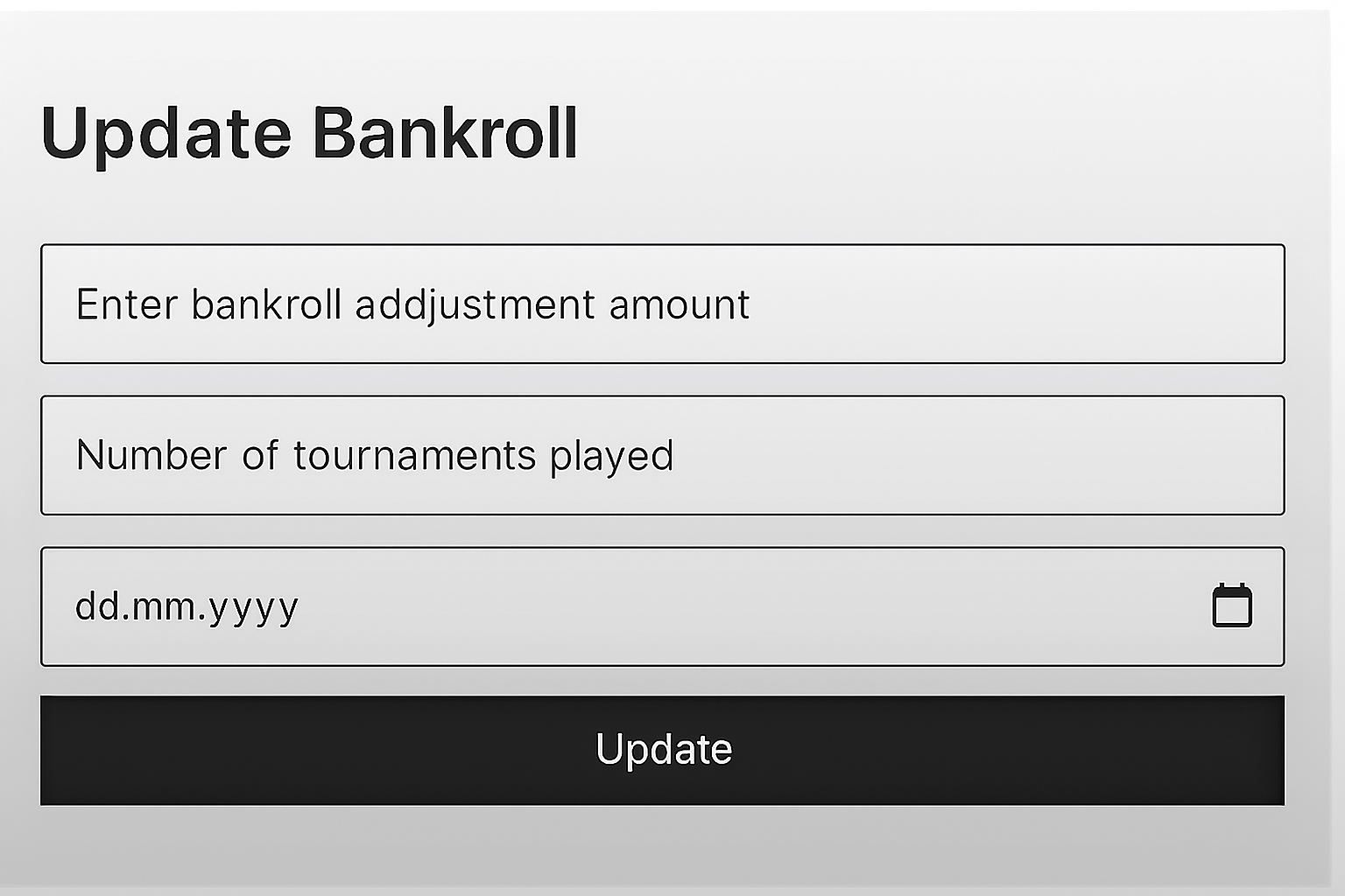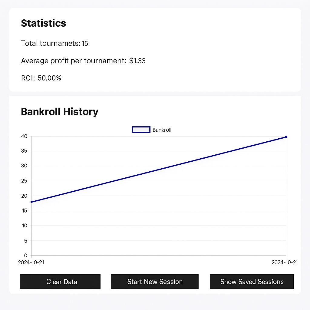 Каждый день вы можете добавлять данные о сыгранных турнирах, выигрышах и количестве игр. Нажав «Обновить данные», вы получите актуальные показатели и ROI, что помогает отслеживать эффективность вашей игры.