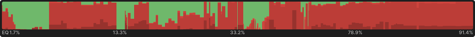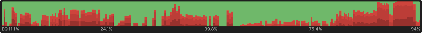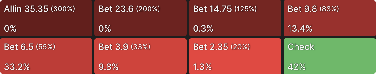 После ставки 33% банка — наиболее часто используемого размера на флопе — BTN далее баррелит около 60% своего диапазона на этой доске, снова отдавая предпочтение размеру ставки в 55% банка:
