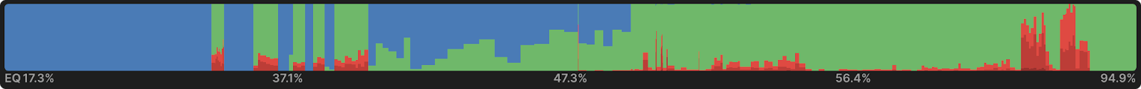 Когда он ставит, это обычно большая ставка около 55% банка и она построена полярно: А - 20%, и 30% он обычно ставит на среднем флопе.