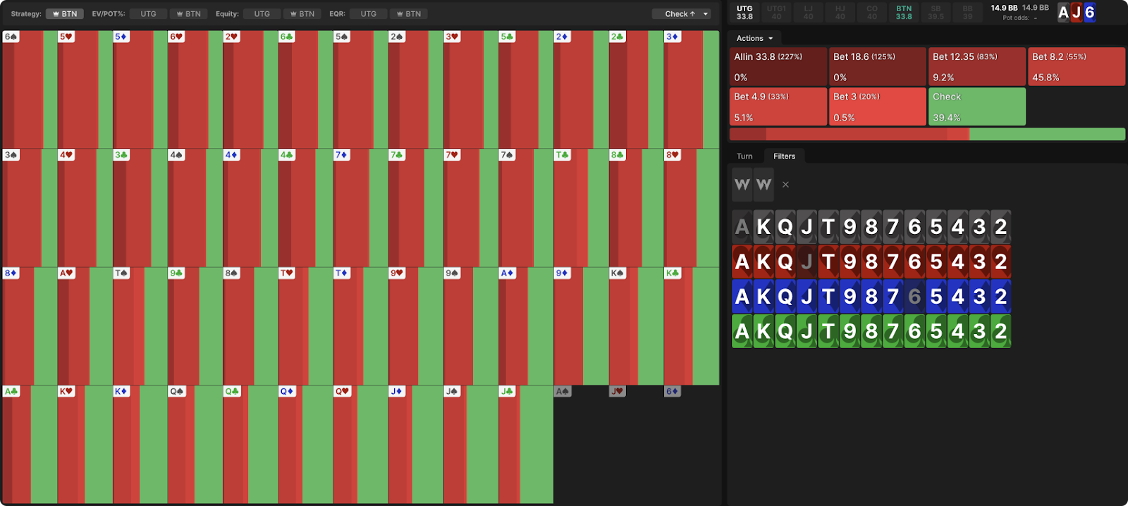 Хотя BTN, как колд-коллер, не ставит в этот флоп особенно часто против UTG, на большинстве тернов он продолжает ставить с большинством своего диапазона, с которым поставил на флопе. Это потому, что UTG уже чекнул большую часть своих лучших рук на флопе, если только текстура доски не изменится значительно на терне — что, по определению, редко бывает на статичном борде — BTN обычно хочет продолжать ставить полярным диапазоном. Его наиболее часто используемый размер ставки на терне — снова 55% банка, что позволяет на ривере поставить олл-ин в размере 82% банка. Это не идеально геометрическая структура ставок, но близко к ней, особенно учитывая, что солвер ограничен в выборе размеров ставок.