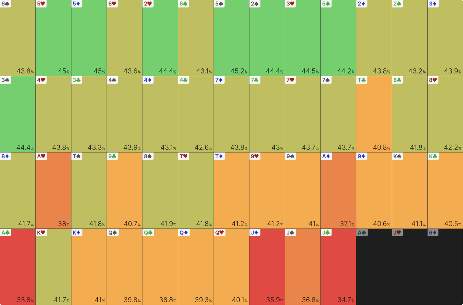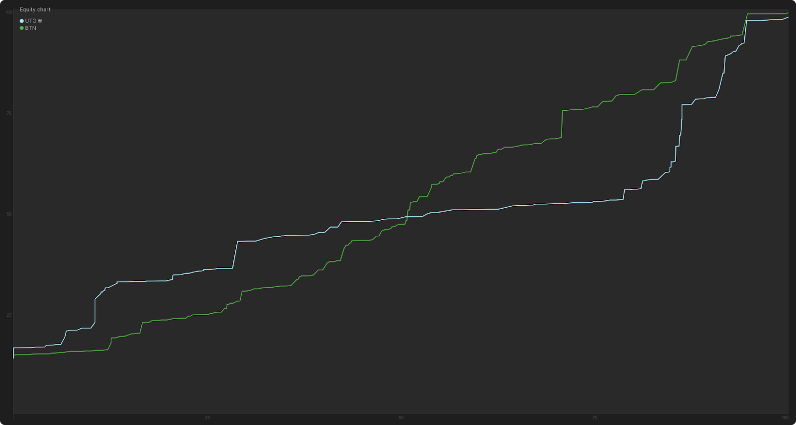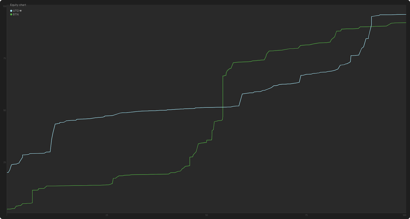 Как видно из общего отчета по тернам выше, не все так просто, как ставить часто на бланках и чекать на картах, меняющих текстуру доски. На самом деле, четыре терна с самой высокой частотой ставок BTN — это карты, закрывающие флеш! на терне, технически, разблокирует UTG, который часто чек-коллит с такими руками, как