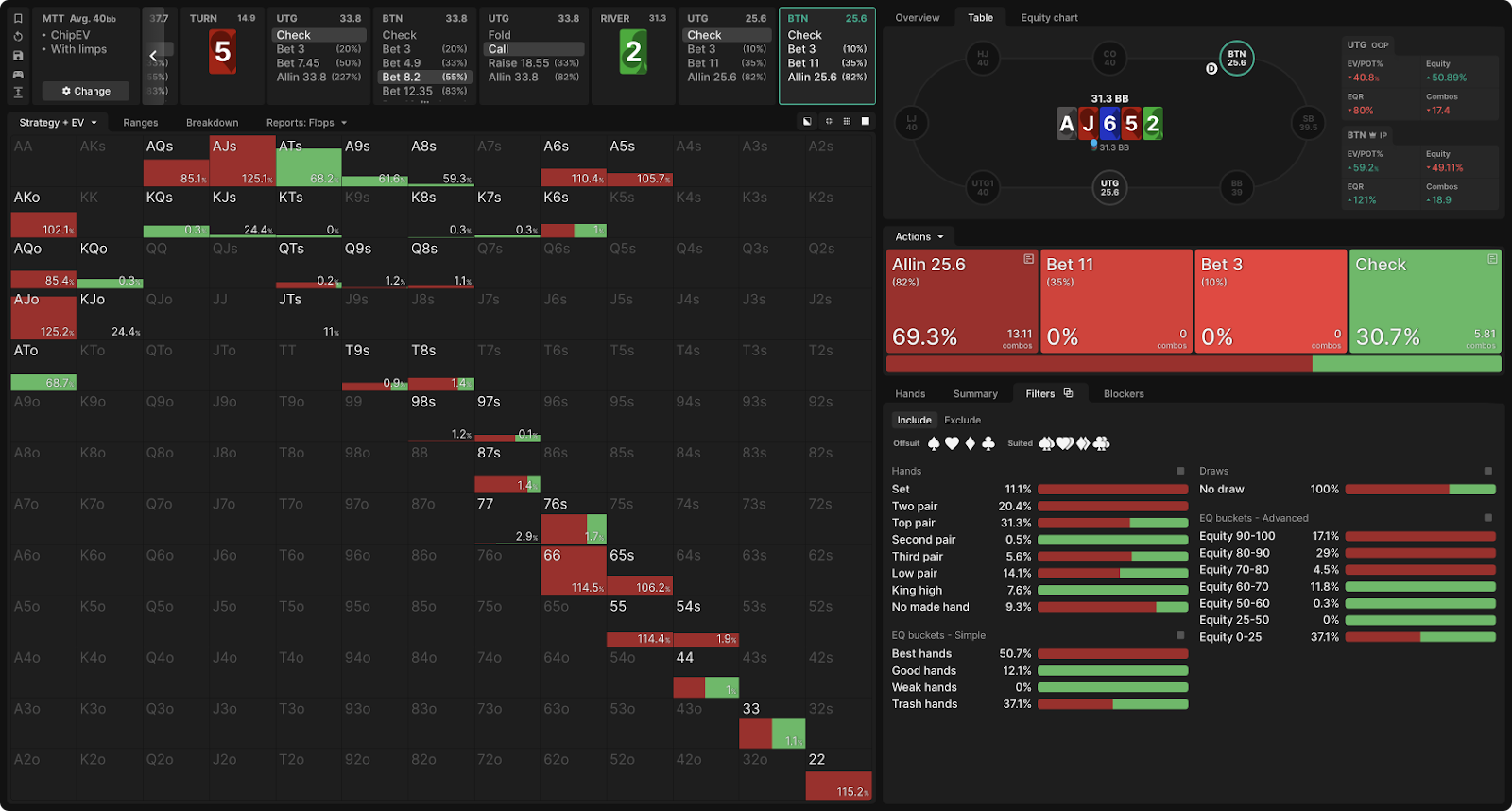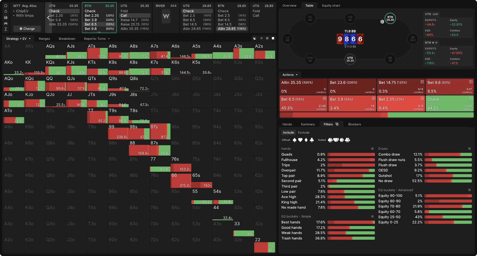 На бланковом ривере, например , BTN продолжает полярную стратегию, ставя олл-ин с 69% своего диапазона. Основная часть диапазона для коллдауна UTG — это руки с тузом, так что любая рука, которая сильнее топ-пары, достаточно хороша для вэлью-пуша, даже если существует реальный риск попасть в медленно разыгранного монстра.