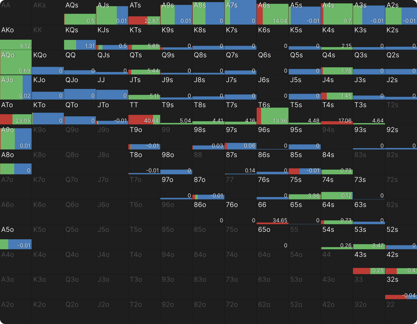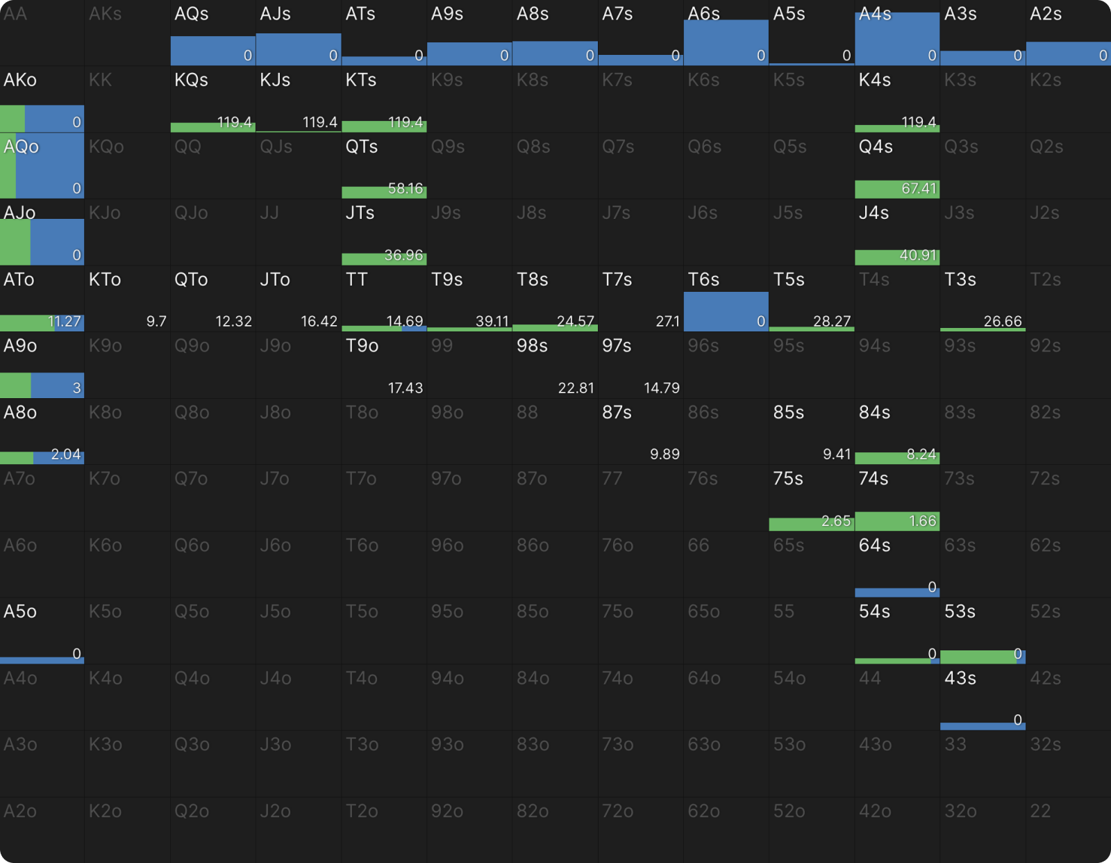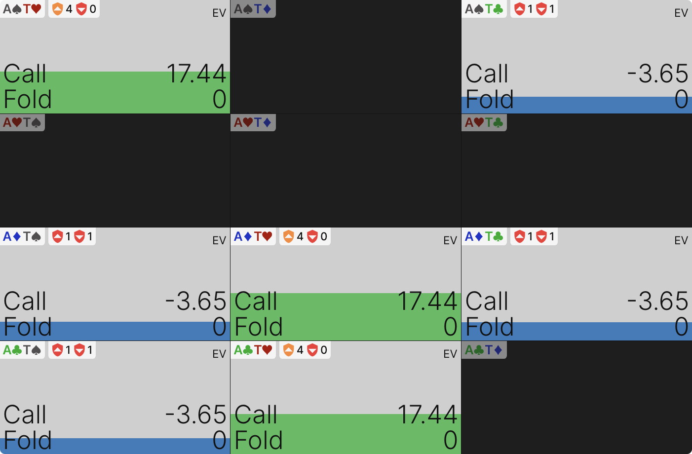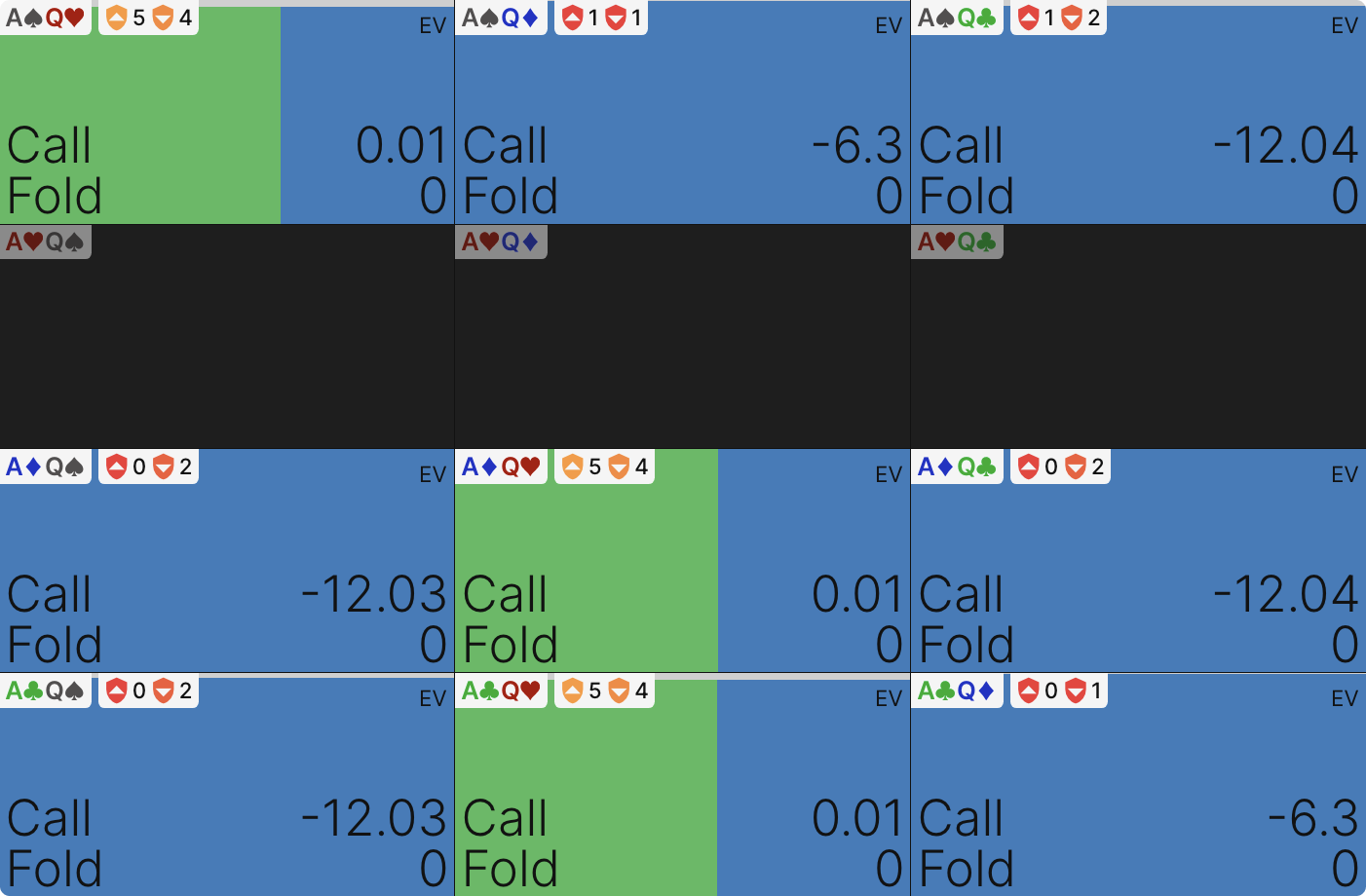 В этой сетке руки отображаются в трех вариантах: полностью зелеными (всегда коллируют), полностью синими (всегда сбрасывают) или сочетанием синего и зеленого (иногда коллируют, иногда фолдят).