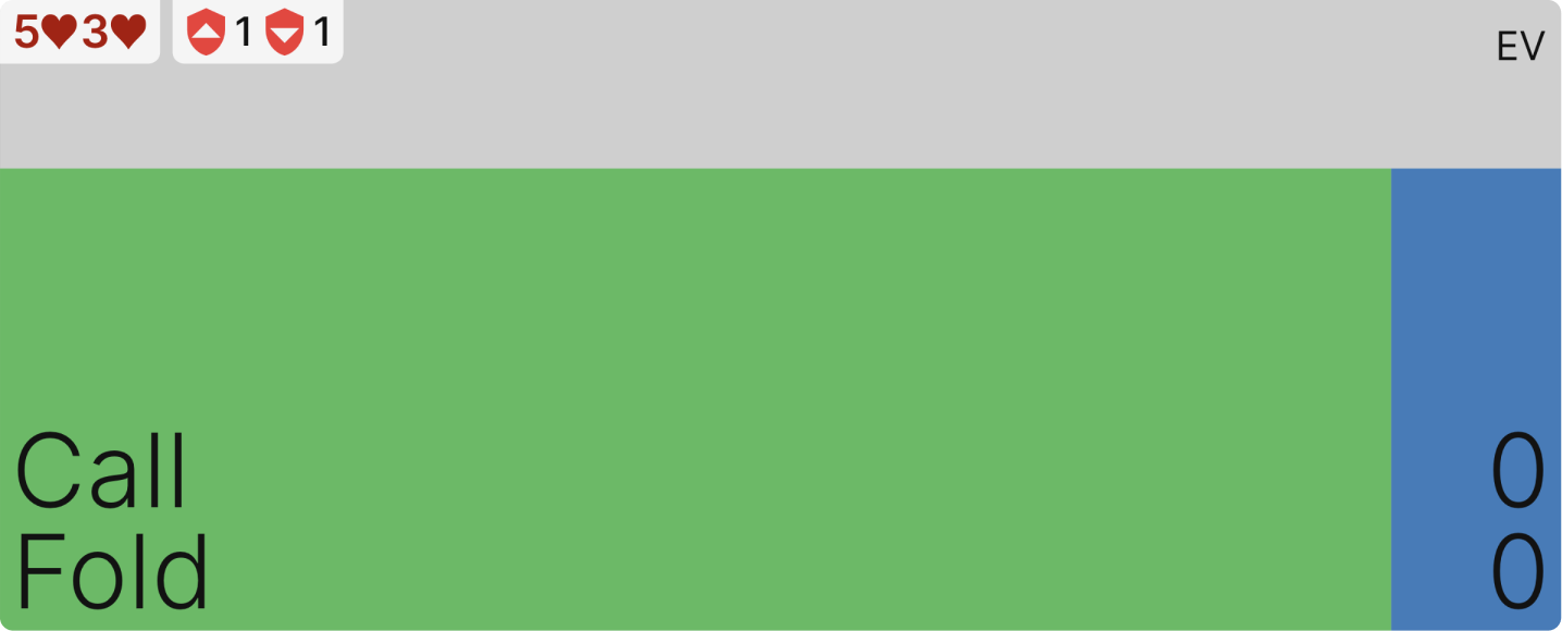 Когда вы комбинируете коллы и фолды, их EV должно быть одинаковым, а поскольку EV фолда всегда равно $0 (в Chip EV среде), то и EV колла при правильном балансе оказывается таким же. Это ключевая причина, почему ловля блефов не приносит дополнительной прибыли: даже если ваш оппонент блефует в точности так, как предписывает теория, а вы идеально определяете частоту колла, ваш выигрыш не будет выше, чем при простом фолде.