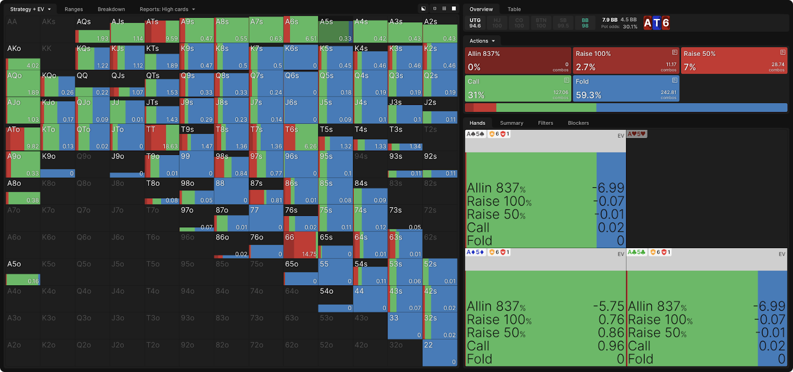 На представленной выше сетке можно увидеть, что колл имеет EV 0,01, но это лишь небольшая погрешность вычислений. Если бы колл действительно приносил хоть минимальную прибыль по сравнению с фолдом, солвер выбирал бы его в 100% случаев. Причем не все флеши оказываются выгодными для ловли блефа.