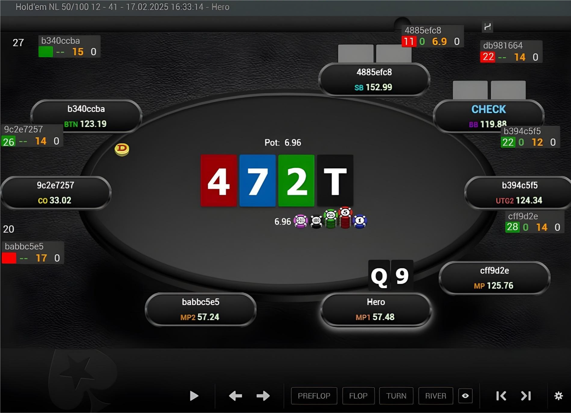 У хорошего игрока всегда есть план на раздачу. Разберем одну интересную ситуацию. На иллюстрации выше изображён довольно динамичный спот CO vs BB. Я задумался, стоит ли мне контбетить флоп в такой граничной ситуации? С одной стороны: У меня есть некоторое эквити: дальний стрит и натсовое бэкдор фд делает эту руку по крайней мере не безнадежной для меня. Также отмечу, что в диапазоне защиты большого блайнда много рук, которых мы старше на таком флопе. Однако в этом споте я играю против довольно агрессивного оппонента ( это наблюдение было подкреплено соответствующими статами из хм3 которые вы не видите на картинке, взятой с реплеера рума )