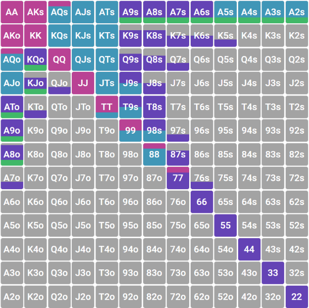 Дальнейшего роста защиты против 3-бета не происходит при увеличение стека, напротив, в стеках выше 90 бб диапазон может даже сократится немного по краям, из-за большей опасности отдавать приличные банки под доминацией по парам и более сложной игры на постфлопе, особенно против агрессивных оппонентов.