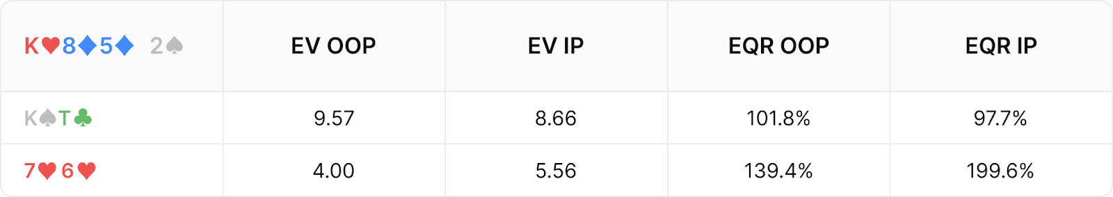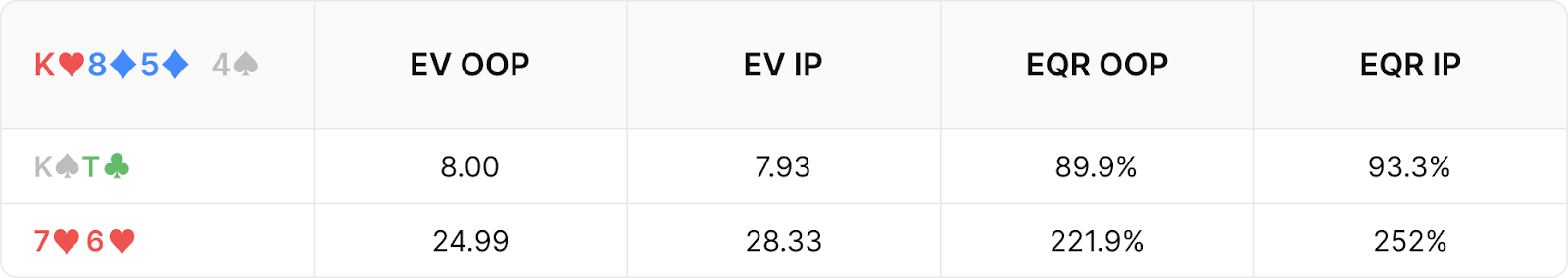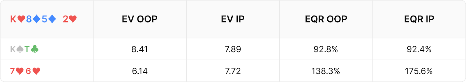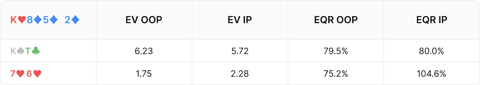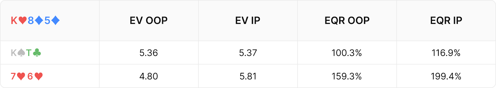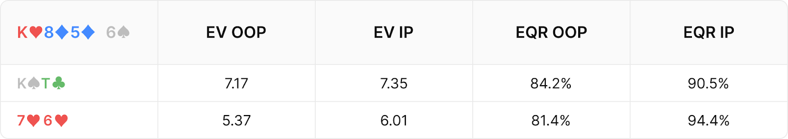 Хорошо, я признаю, что не предоставил достаточно информации, чтобы ответить на этот вопрос. Допустим, у нас глубина 100bb в МТТ в сингл рейз поте, и турнир только начался, поэтому мы используем ChipEV диапазоны. Катофф (СО) только что сделал конт-бет в размере 33% банка с КТо на флопе hearts-kingdiamonds-eightdiamonds-five , а у Баттона (BTN) - червовые 76. У кого больше EV? Возможно, вы пришли к выводу, что я бы не стал задавать этот вопрос, если бы ответ не был “у 76”. Несмотря на то, что это «всего лишь» дро, его EV составляет 5,81bb, а у КТо EV — 5,36bb. Это не просто функция позиции. У КТо на BTN почти такое же EV (5,36bb).