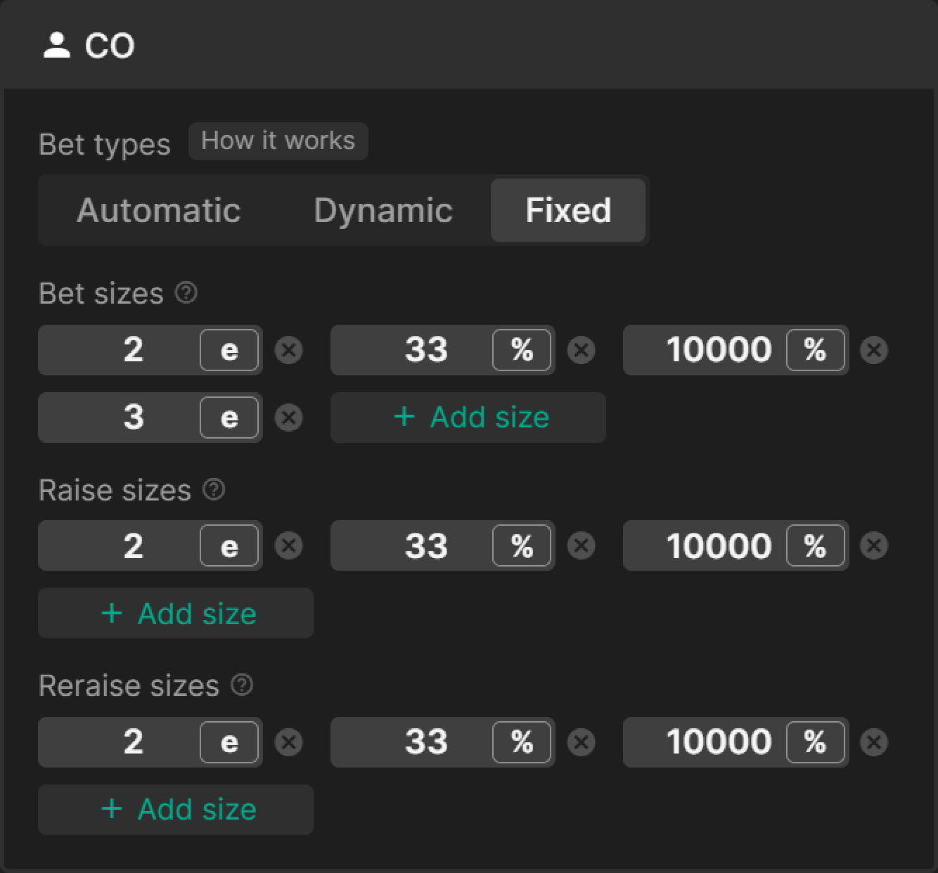 Мы используем кастомное решение, в котором игрокам разрешено ставить 33% банка, геометрические размеры для ставок по трем улицам, геометрические размеры для двух улиц или пуш на флопе, с аналогичными опциями на последующих улицах: