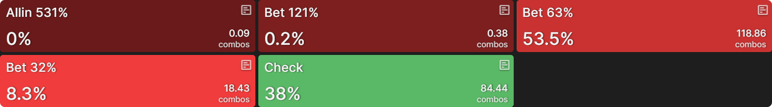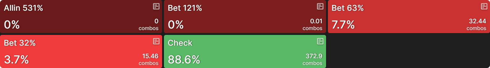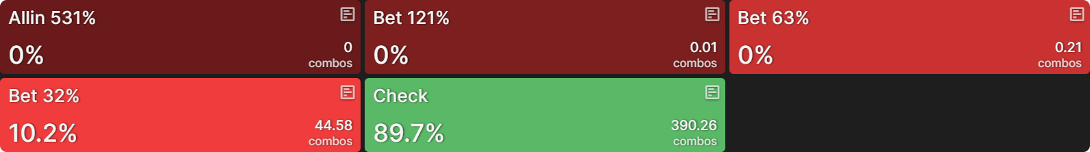 После того как CO чекает, равновесная стратегия BTN предполагает чек около 75% рук. Если BTN всё же делает ставку, он использует размер 63% банка (геометрическое бет-сайзинг на три улицы):