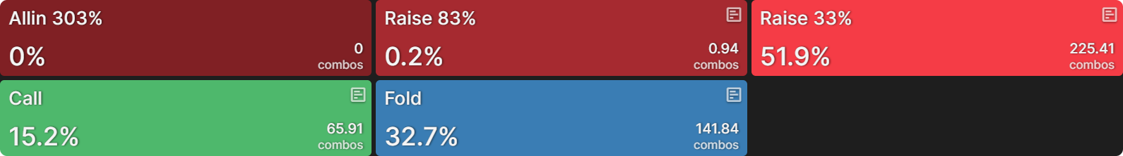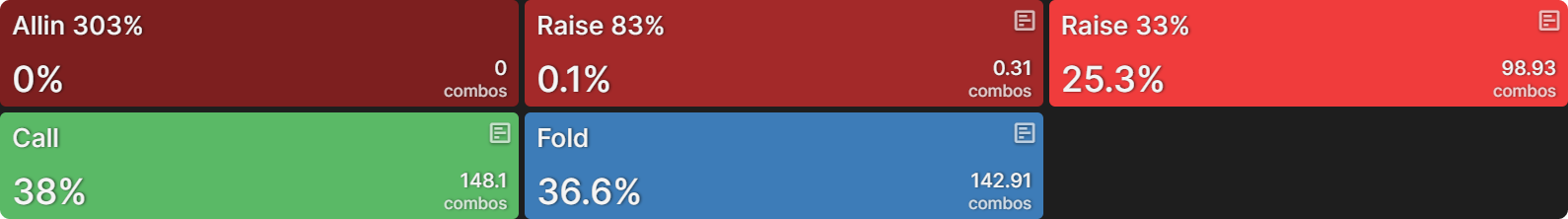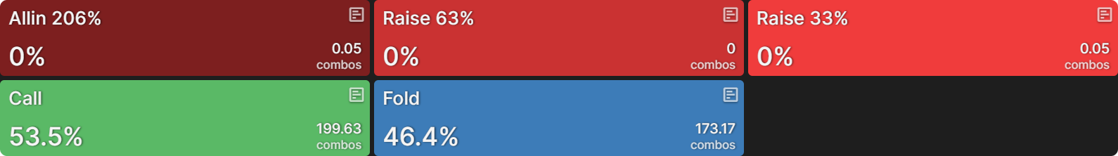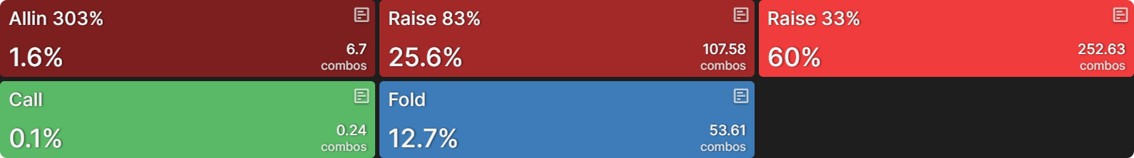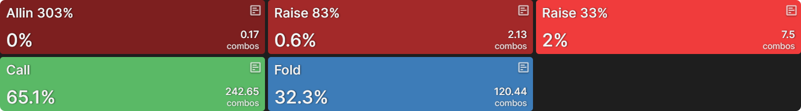 Поэтому его ответная стратегия сводится к двум действиям: коллу или фолду, причём диапазон делится примерно поровну между этими опциями: