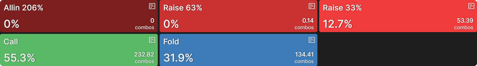Если вы ожидаете, что ваш оппонент сделает ошибку на определённой ветке дерева решений, вам выгодно направить его по этой ветке. Однако ответ CO на ставку в 63% банка изменился. Теперь он фолдит гораздо реже и добавляет значительный диапазон рейзов.