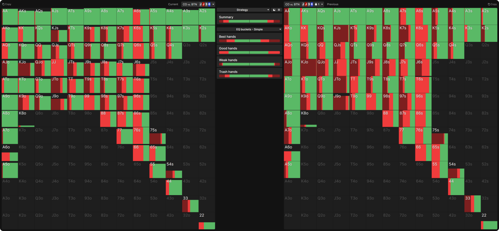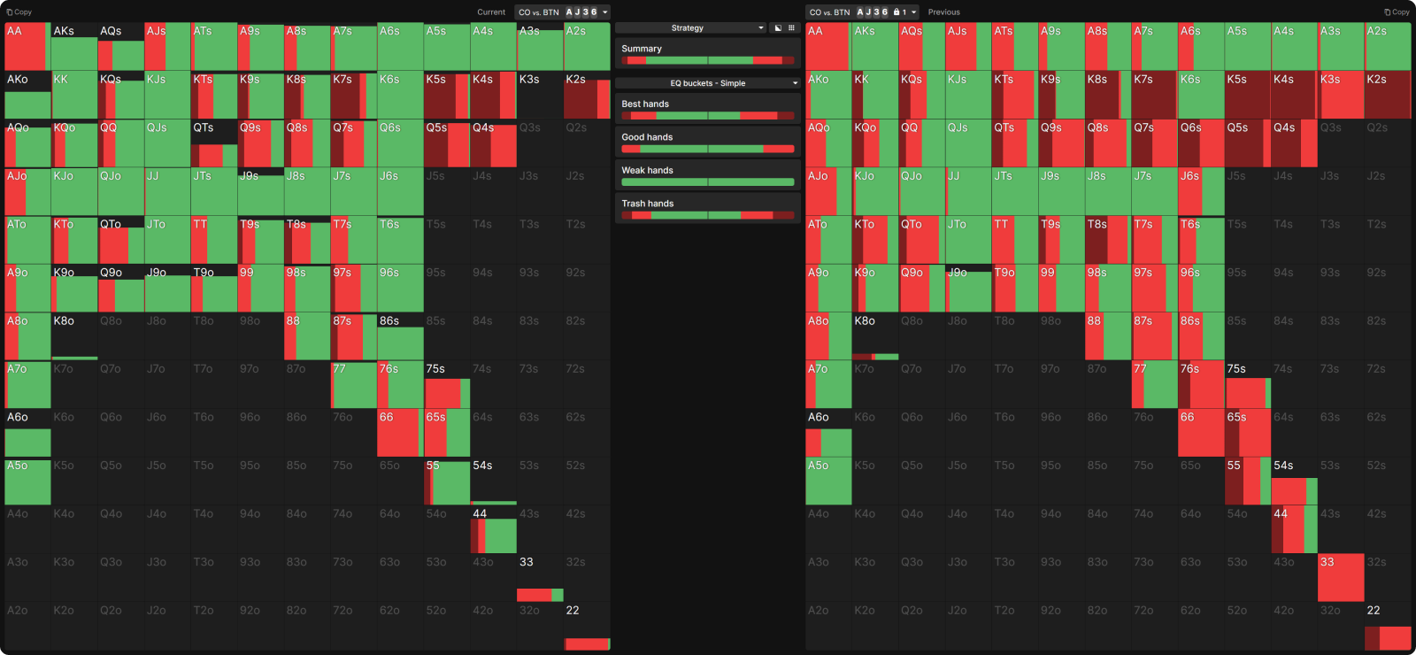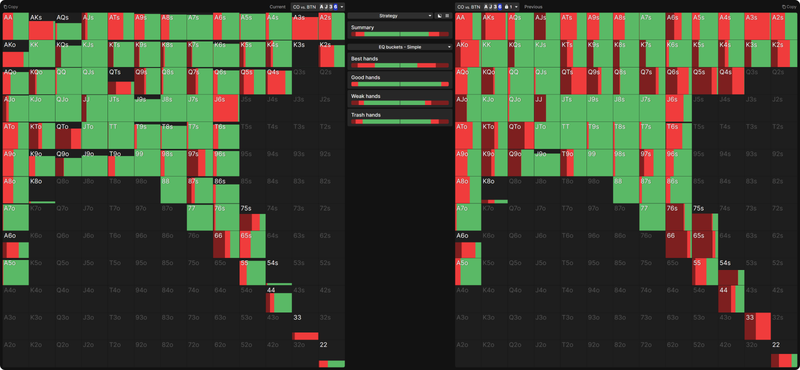 Мы сравним стратегию CO в равновесии на нескольких показательных флопах с эксплуатационной стратегией на них, когда у BTN стратегия залочена так, чтобы чекать в два раза реже, чем в равновесии.