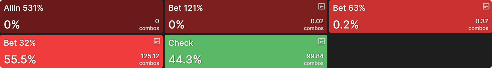 Главное различие в стратегии CO — значительное увеличение частоты овербетов, с 9% до 19.9%. BTN, который ставит слишком много на флопе, вряд ли будет иметь сильные руки после чека, что делает его лёгкой целью для овербетов. Для ясности: BTN всё ещё может чекать сильные руки. Блокировка стратегии влияет только на частоту чеков, но солвер оптимизирует диапазон чеков в рамках установленного ограничения. Если BTN начнёт чаще чекать сильные руки, это сделает его диапазон ставок более уязвимым для агрессии.