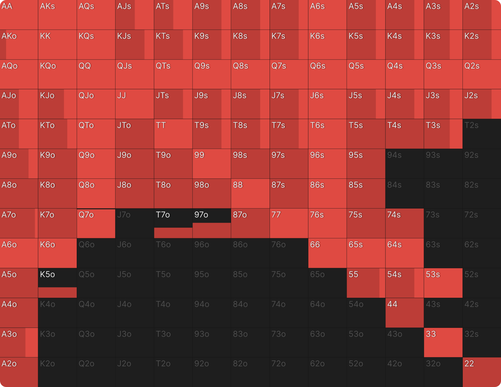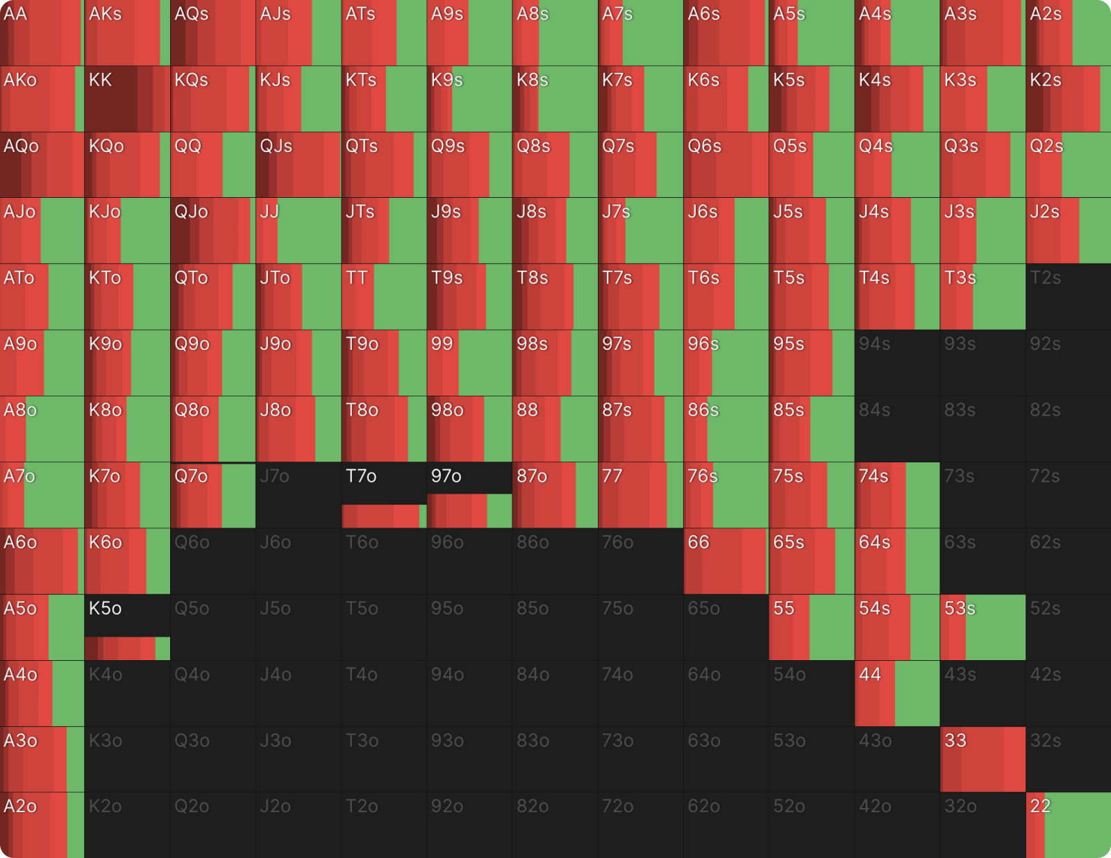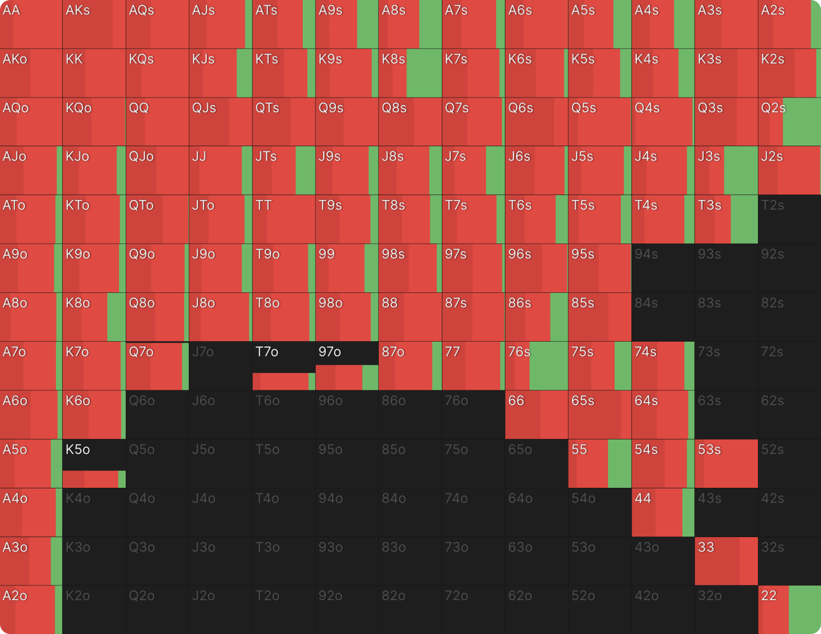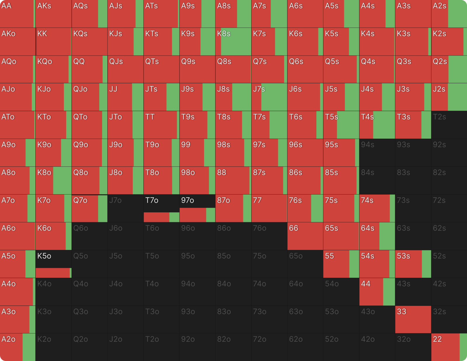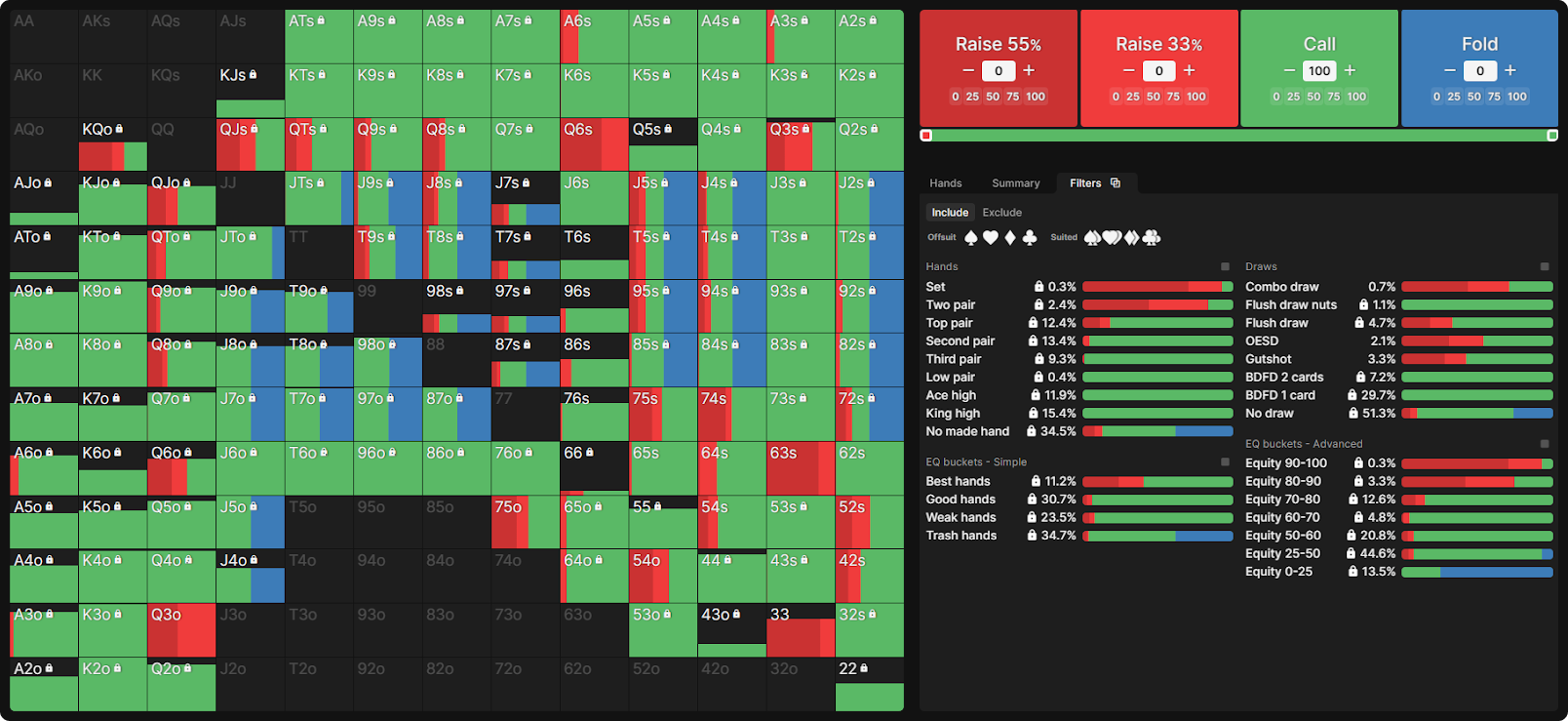 Фильтр «Grouped» позволяет нам группировать размеры ставок в абстрактные категории (Малая/Средняя/Большая ставка или Овербет). Если мы наведем курсор на иконку в правом верхнем углу группы «Малая ставка», мы сможем увидеть разбивку диапазона ставок по классам рук.