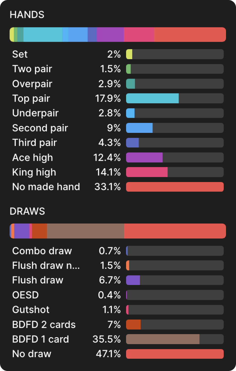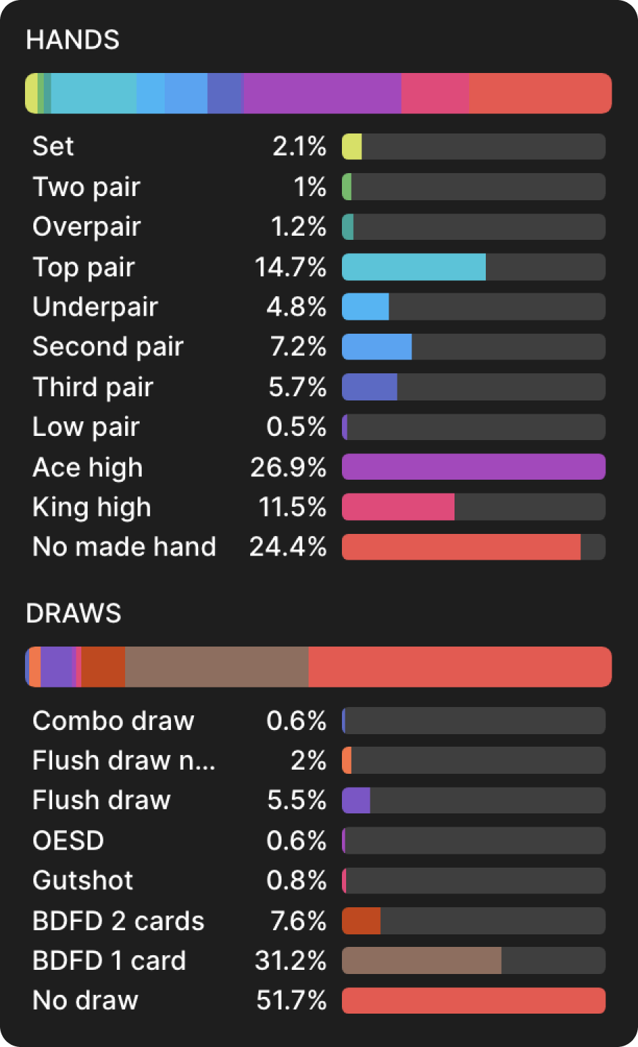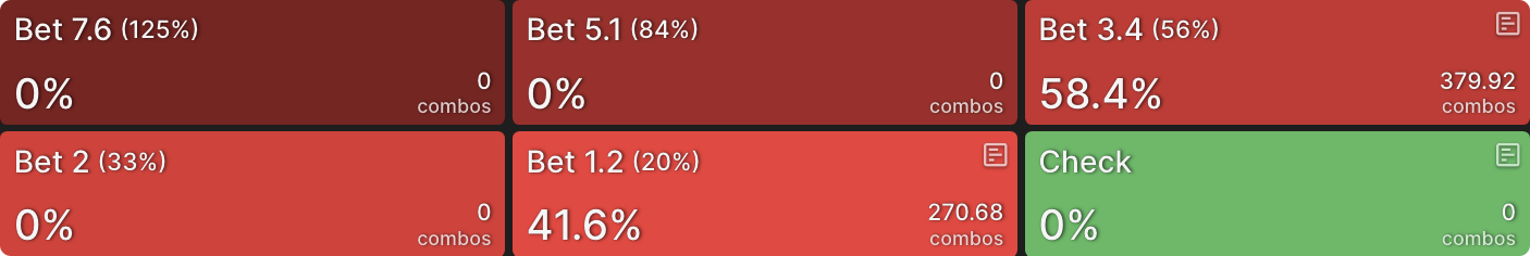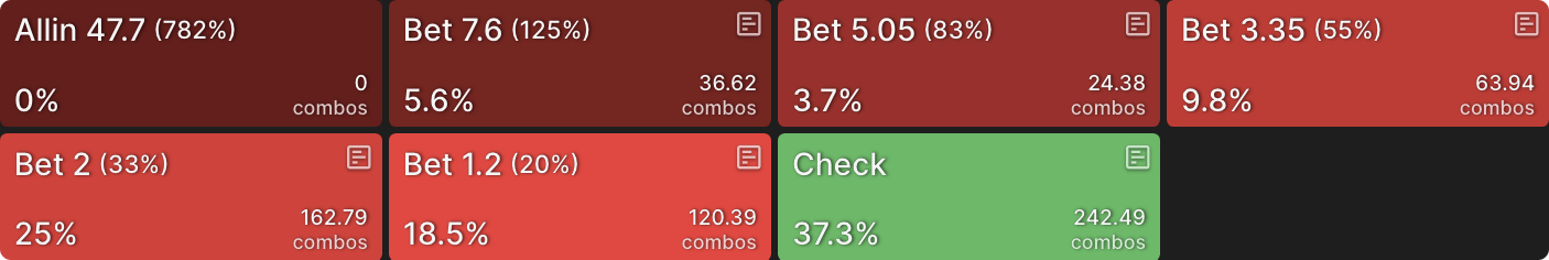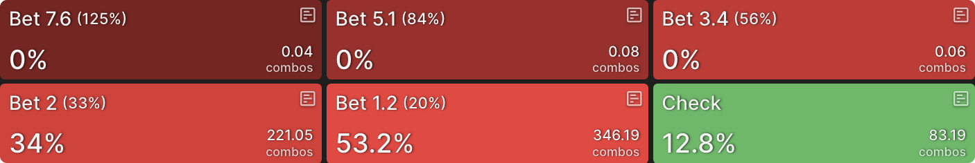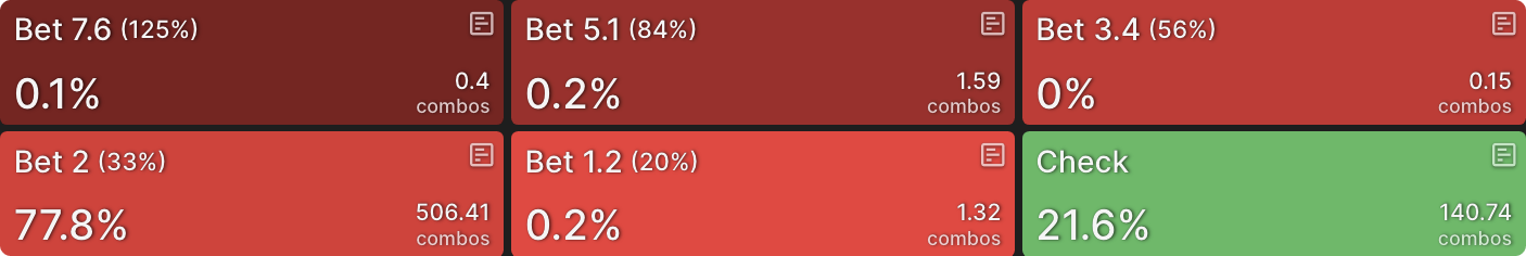 Решение солвера - использовать смесь разных размеров ставок. Хотя два меньших размера ставок предпочтительнее, у нас есть руки, которые ставят около 50% пота, и — одна из них. На этом этапе я мог бы гордо выпятить грудь и заявить, что сыграл руку правильно, а затем перейти к следующей. Так делают некоторые игроки, когда работают с покерными решениями — они «проверяют линию» руки и идут дальше, не углубляясь в анализ.