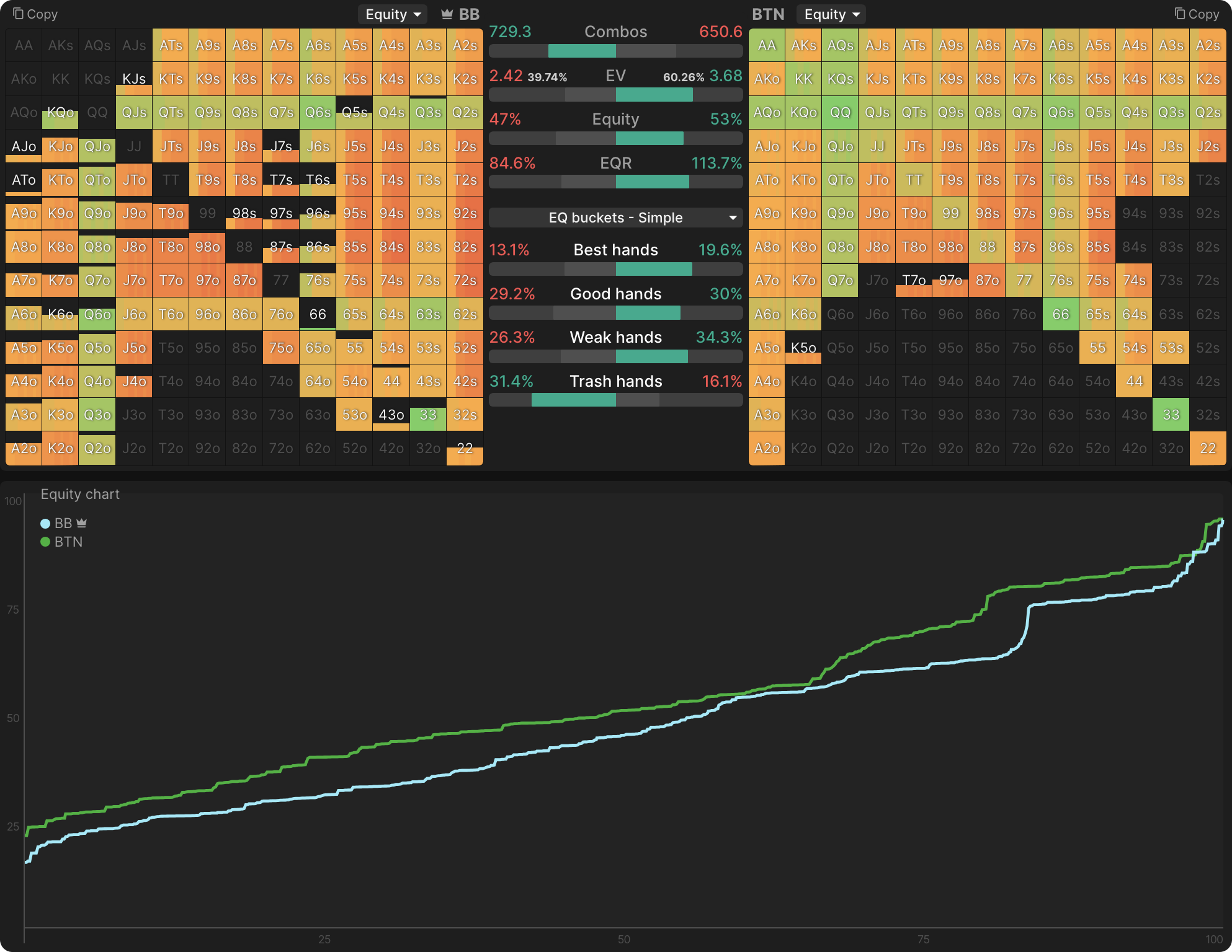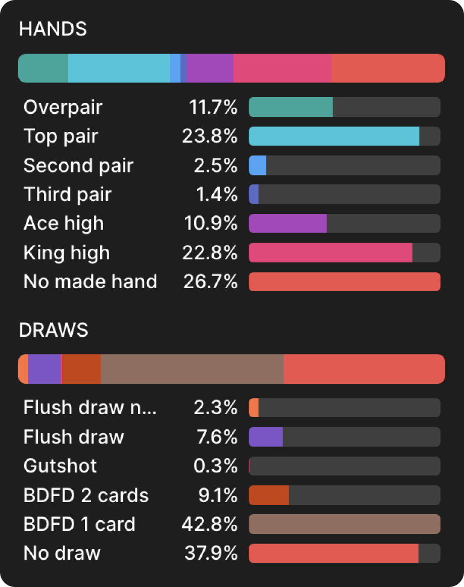 Во-первых, сама ставка — это относительно частое явление для этого флопа: мы ставим около 63% раз, а чекаем 37%. BTN имеет легкое преимущество в диапазоне (53%), и как я уже говорил, у нас больше «лучших рук», но это очень близко: