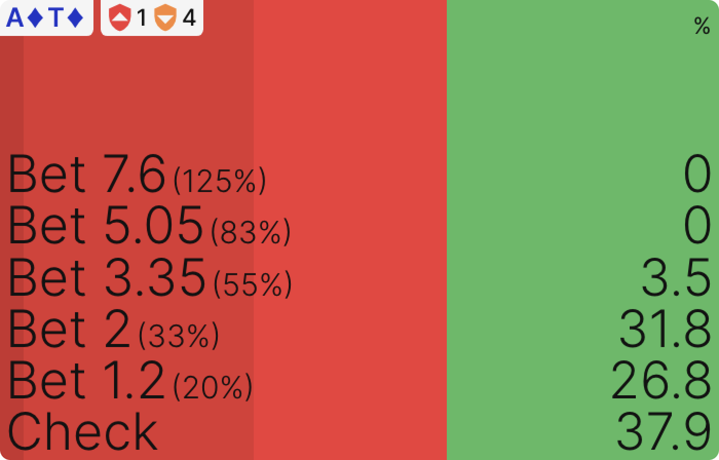 Ох, похоже, что всё пошло не по плану. Теперь мы перестали использовать средний размер ставки в этой ситуации, и фактически, мы исключительно используем маленькую ставку в 33%, чтобы использовать то, что наш оппонент никогда не сбросит, делая тонкие вэлью беты с более широким диапазоном. На самом деле, я хотел сказать, что игроки в моих играх воспользуются такой маленькой ставкой, часто повышая ее.