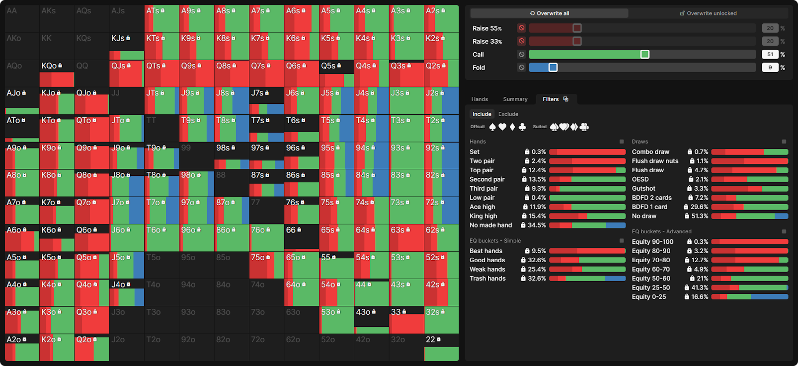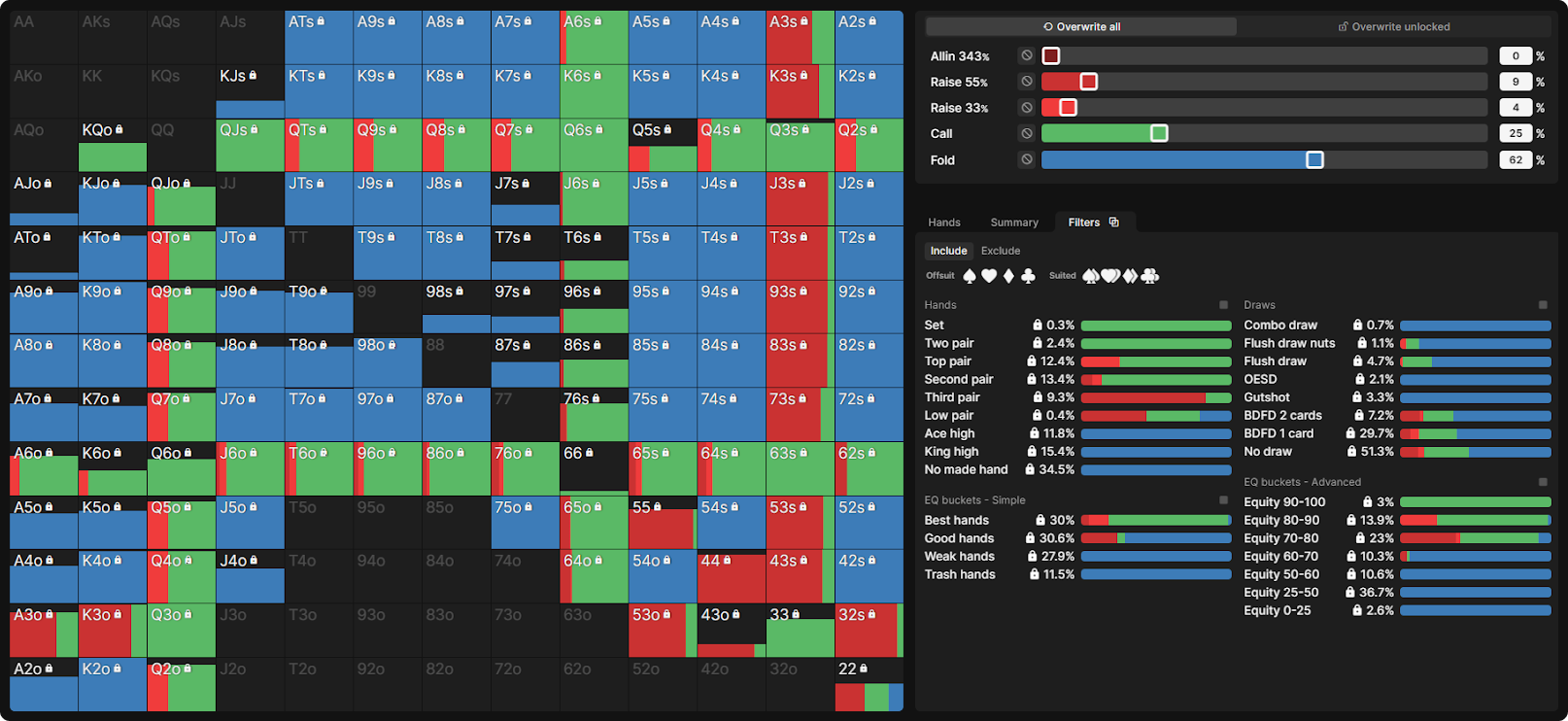 Также очень полезно подходить к выводам солвера с намерением изучить не только конкретную раздачу, с которой вы столкнулись. Когда вы изучаете, как должен играться ваш весь диапазон, а также как играл ваш оппонент в свете того, что для него теоретически оптимально. Это должно уменьшить необходимость валидации своей идентичности, так как ситуация становится менее личной. Это меньше касается того, что вы сделали с вашей рукой, и больше — того, что каждый игрок должен делать со всеми своими руками.