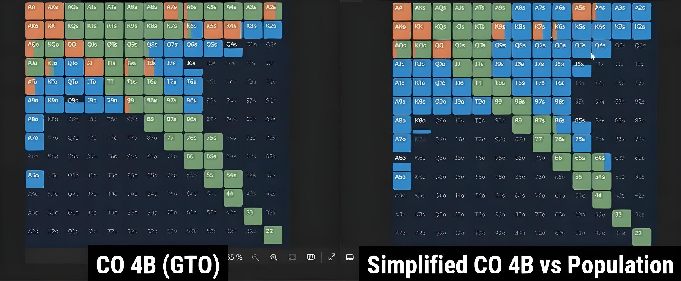 Результат — значительно упрощенная стратегия 4-бета, которая удаляет из симулятора многие линии колла/фолда/4-бета со смешанной частотой. Вместо того, чтобы играть по сложной смешанной стратегии с такими руками, как KJo и K6s, диапазон 4-бета по упрощенной стратегии против поля дает четкое решение практически для каждой руки в диапазоне. В целом, реакция Катоффа более тайтовая: меньше коллов и 4-бетов. Сам по себе диапазон 4-бета гораздо более вэлью-ориентирован: всего несколько блефовых рук A-х, таких как A5s, AQo и K9s, уравновешивают велью на QQ+ и AKo. Этот диапазон можно использовать против любого противника, о котором вы мало что знаете, — и использовать при этом эффективно.