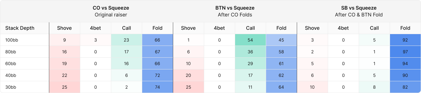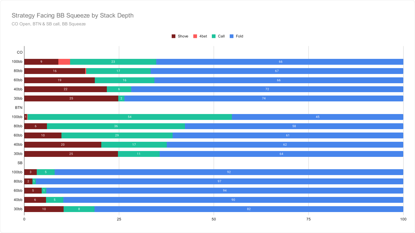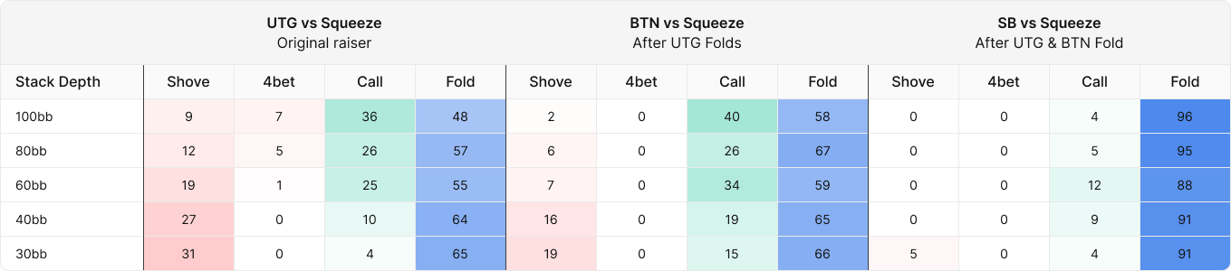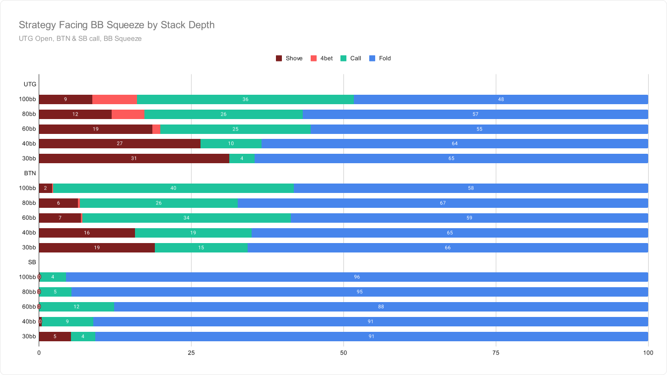 Столкнувшись со сквизом, все игроки сбрасывают свои худшие руки. Они 4-бетят или пушят большую часть своих лучших рук, помня, что в зависимости от действий на префлопе таких рук у них может быть не так много. Самые крупные пары коллируют в качестве ловушки. Помимо этого, можно отметить два типа диапазонов: один - при котором может быть хедз-ап пот, и другой, где диапазоны с оверколлом, в которых могут быть мультивей поты, если розыгрыш вообще дойдет до флопа.