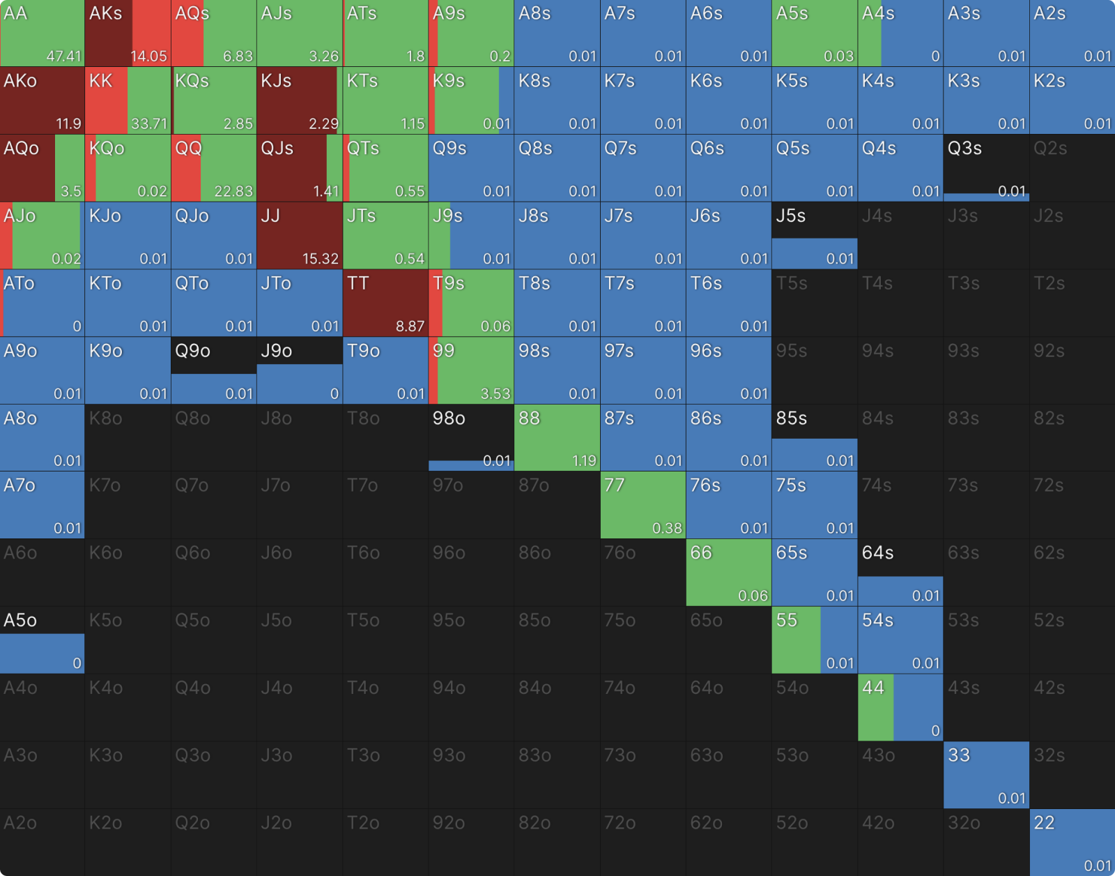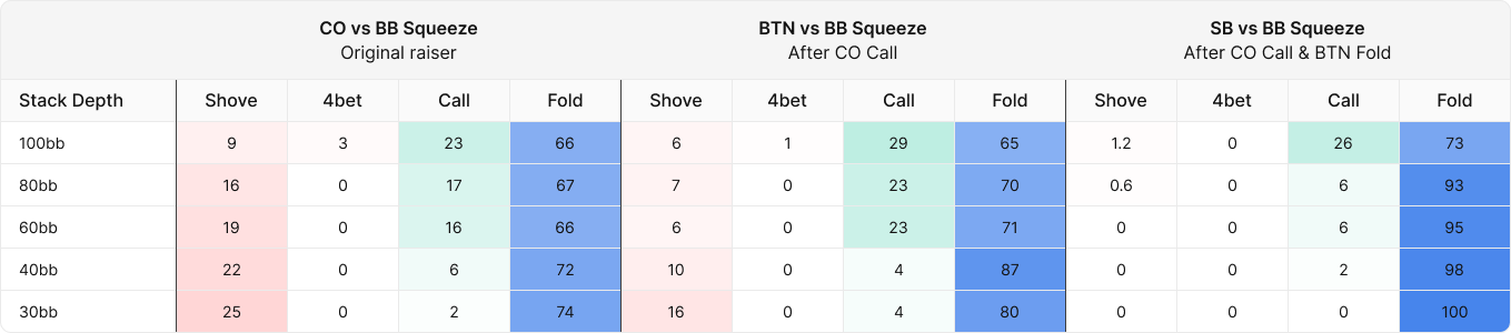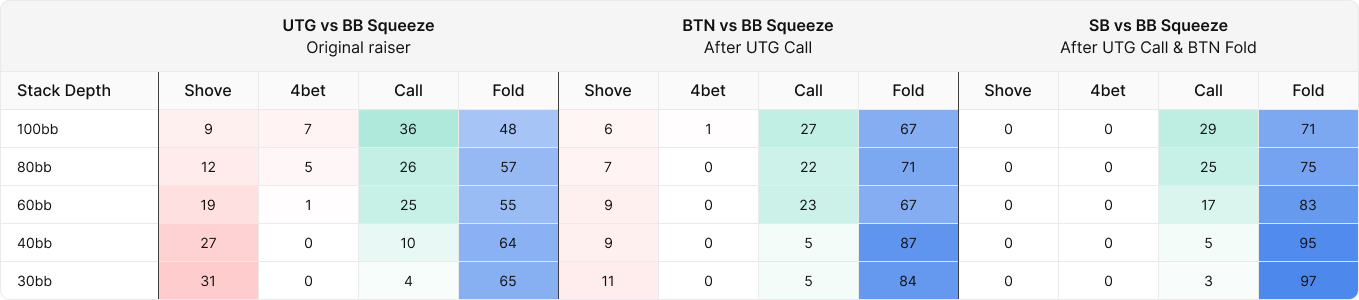 BTN, наоборот, пушит меньше, чем когда первоначальным рейзером был CO, и чаще фолдит, даже после того, как UTG сбросил карты. Это связано с тем, что диапазон BB для сквиза при открытии из UTG значительно сильнее (7,9% рук в глубине 100bb против 13% при открытии CO). Диапазон BTN несколько сильнее, но не настолько, потому что он рассчитывает играть в позиции на постфлопе, и в его диапазоне есть несколько маргинальных рук. Как и в случае с рейзером из поздней позиции, у BTN соотношение коллов к 4-бетам выше, чем у UTG. Частично это опять же потому, что его диапазон менее натсовый, но также и потому, что его позиция уменьшает необходимость лишать эквити игрока, стоящего за ними.