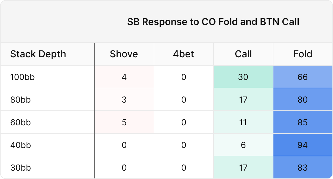 Это менее справедливо, когда первоначальным рейзером является CO, потому что тогда диапазон SB в целом намного слабее, относительно предыдущего сценария, где опен-рейзер был на UTG. Столкнувшись с рейзом из поздней позиции, SB имеет больше стимулов для сквиза сразу, за исключением очень глубоких стеков. Следовательно, у него очень мало рук, достаточно сильных, чтобы выдержать два сильных диапазона, а при стеках в 30bb их вообще нет. Для SB дела обстоят немного менее мрачно, если сквиз коллирует BTN. Он по-прежнему не сильно оверколлит, но колл BTN менее устрашающий, чем колл CO.