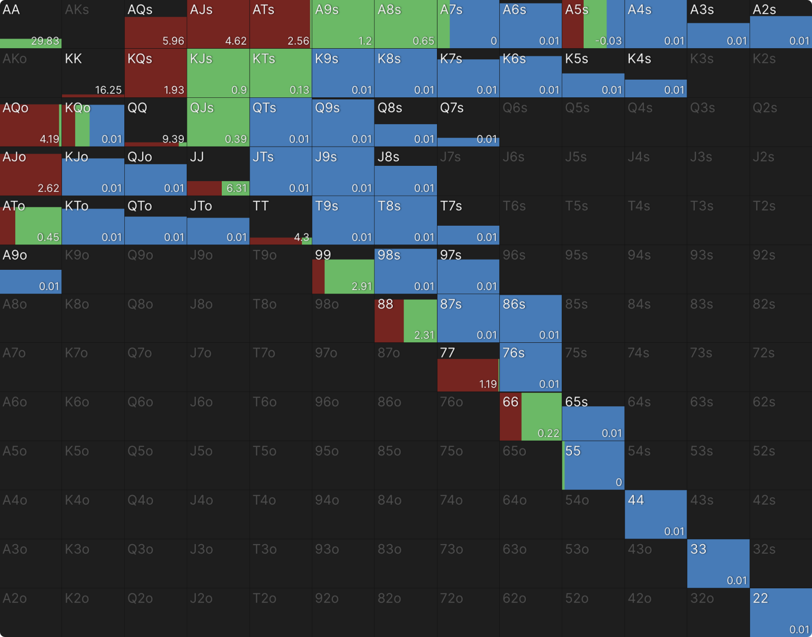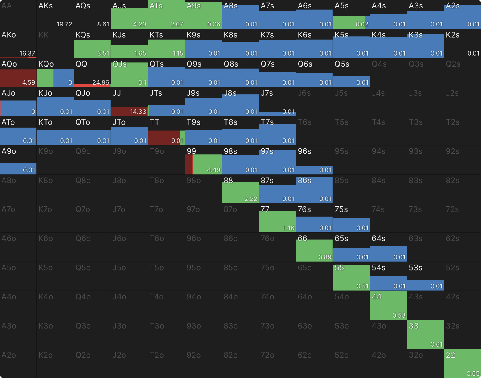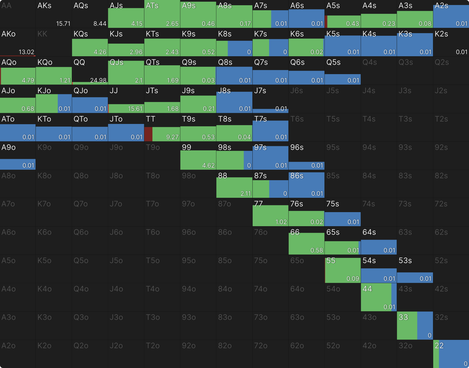 В этот диапазон входят не только руки, которые хорошо себя проявляют в мультипоте (карманные пары и одномастные бродвеи), но также некоторые одномастные коннекторы и разномастные бродвеи, которые плохо сохраняют свое эквити в мультипотах. Это связано с тем, что в этом сценарии баттон часто будет играть один на один в позиции против BB.