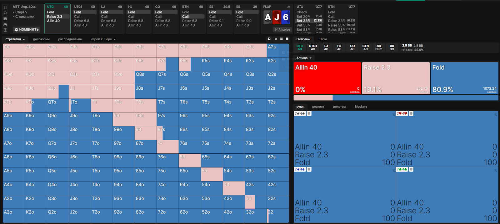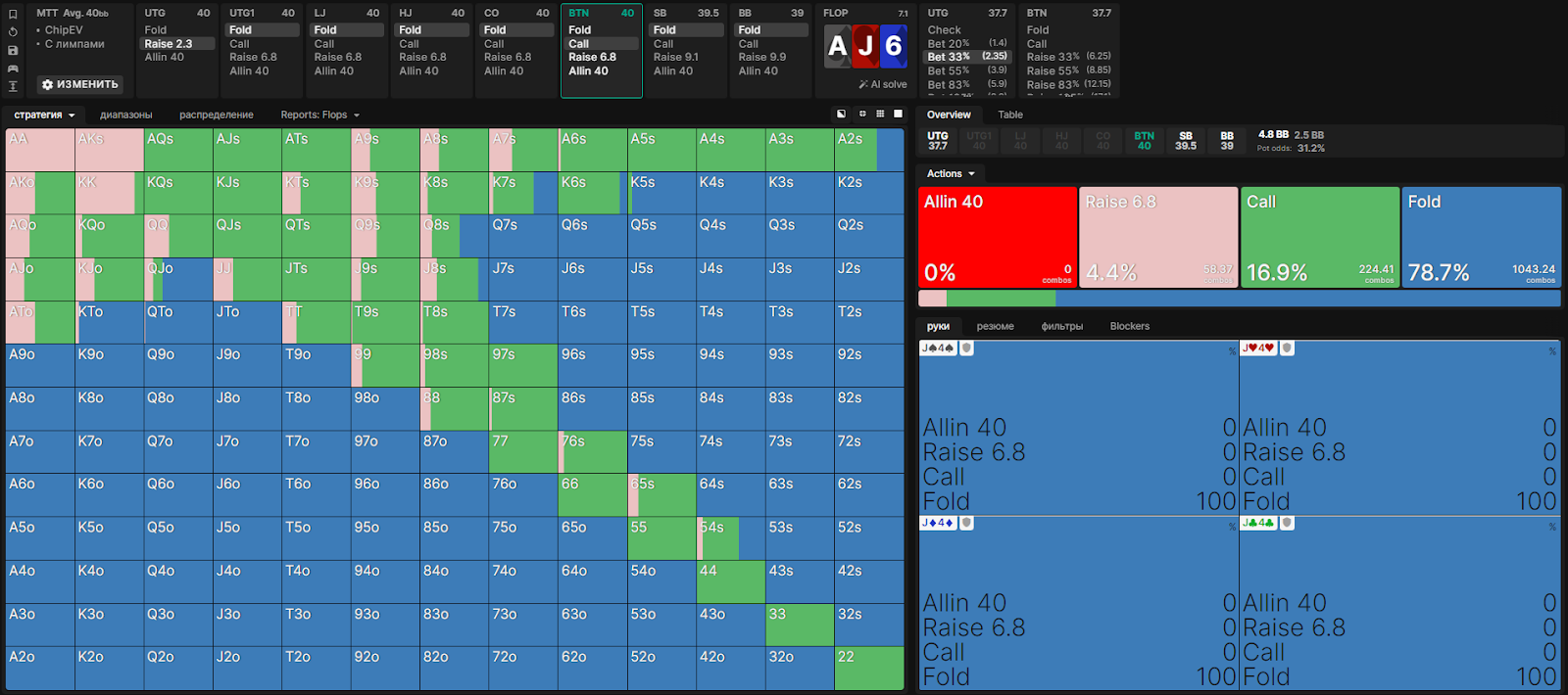 Во-первых, давайте посмотрим на стратегию GTO Wizard в ChipEV среде для колла рейза 2,3 ББ от UTG на баттоне в стеках 40 бб.