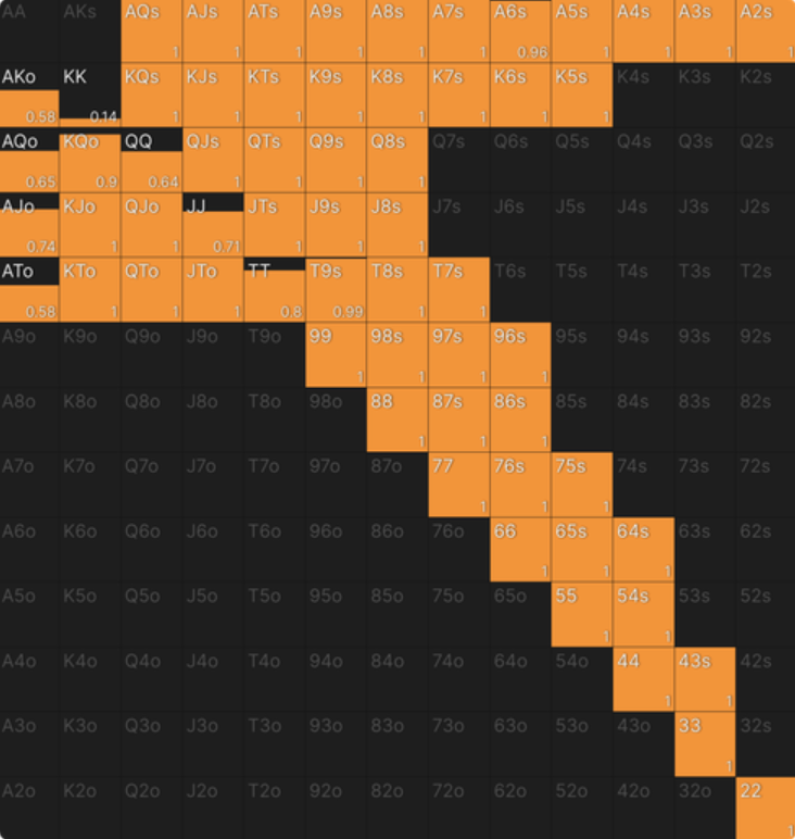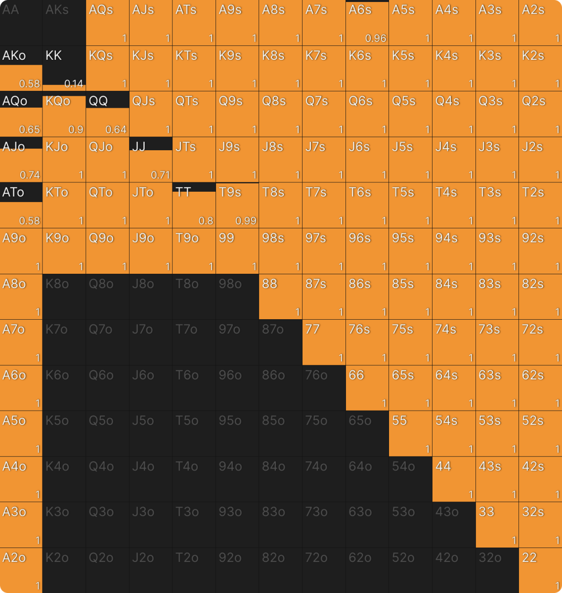 - UTG делает больше ставок на блокировку/защиту с руками средней силы, такими как 99, TT и слабым Ax. Эти небольшие ставки лишают некоторых Kx и Qx эквити, и их коллируют карманные пары, 6x и гатшот. UTG также включает в себя несколько ловушек в этом небольшом диапазоне ставок, в частности JJ и AA, а также несколько слабых Ax, чтобы получить выгоду от стимула BTN перекрутить его.