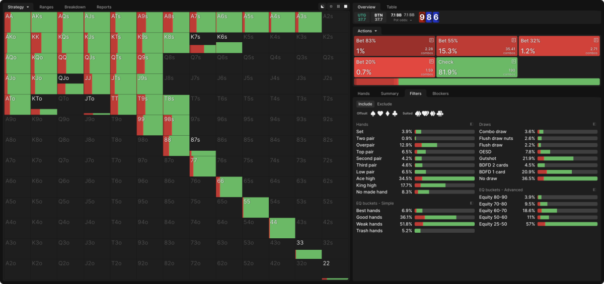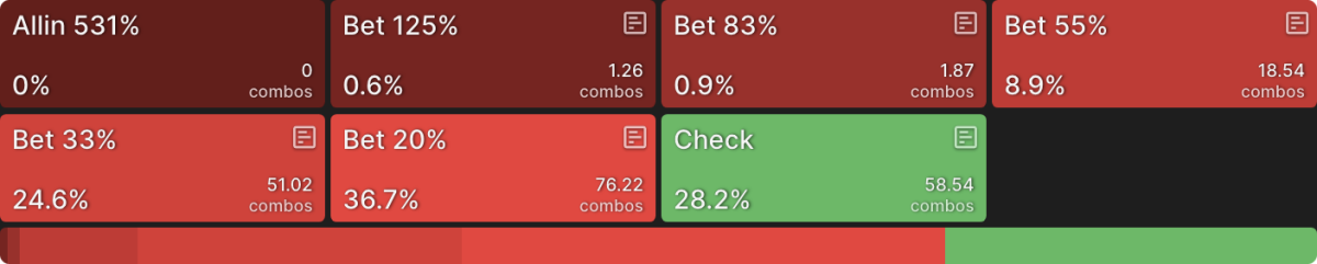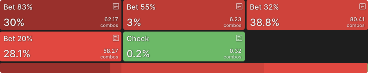 А вот против Спекулянта GTO Wizard никогда не делает чек и в значительной степени использует размер ставки в 83% банка, который совершенно не используется в равновесной стратегии: