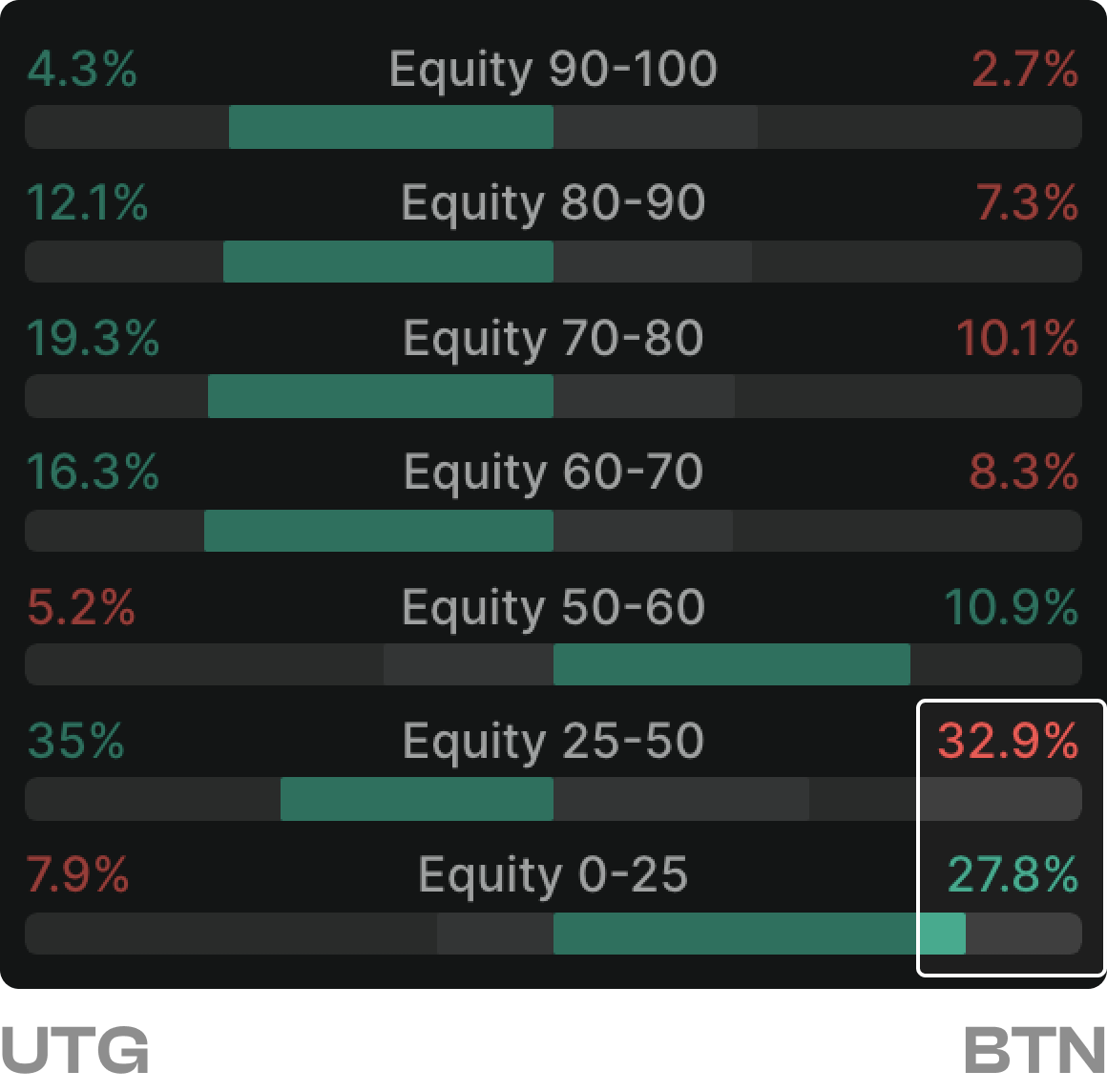 GTO Wizard также ожидает, что UTG выиграет в среднем примерно на 10% меньше, чем против более тайтового коллера с BTN. Так что происходит?