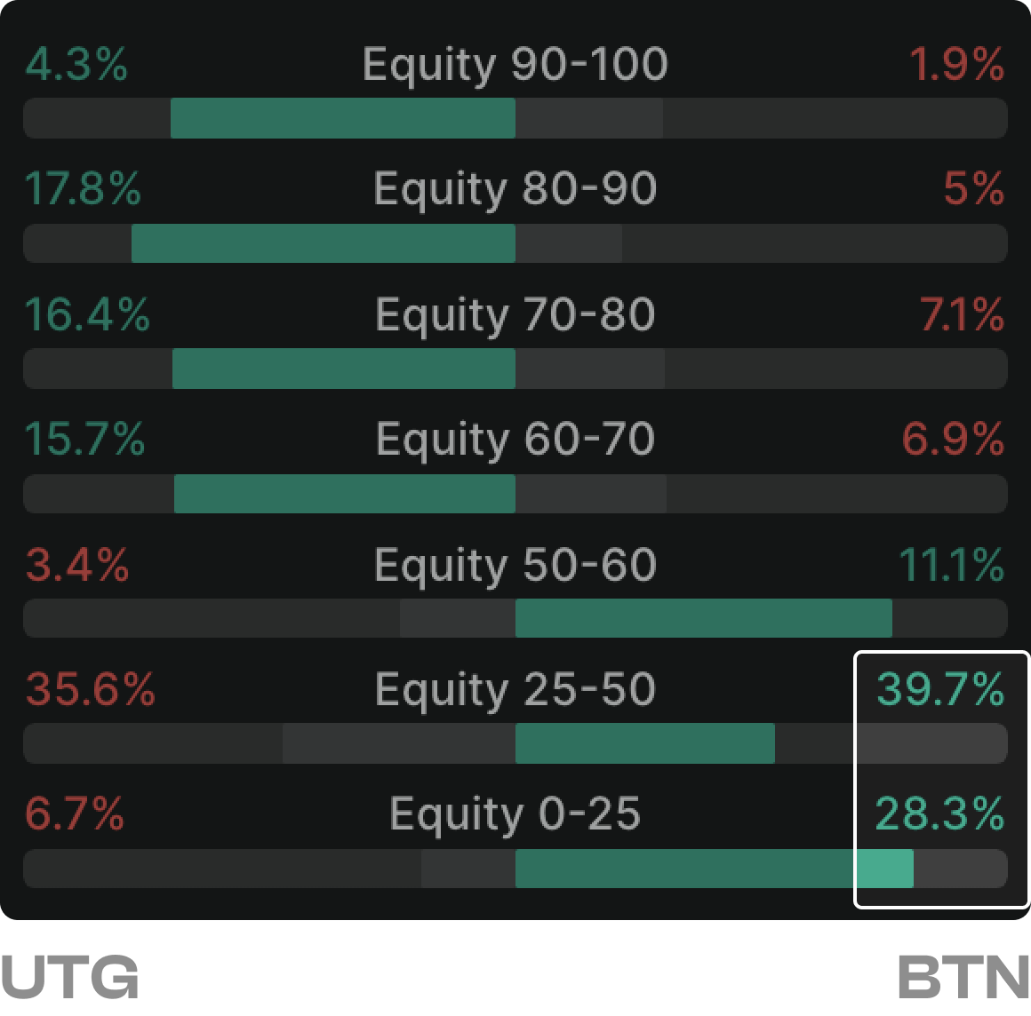 У UTG эквити больше, но оно находится в руках, которые хороши, но не прям супер, и которым будет сложновато реализоваться.