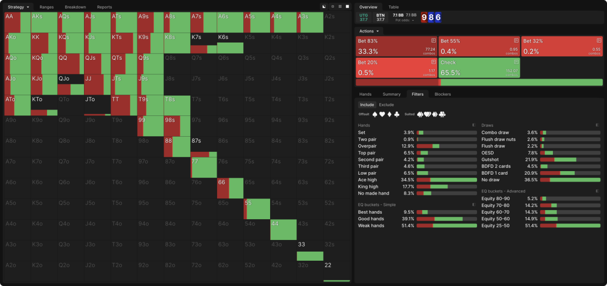 - Слабые руки, такие как K9s и 98s, которые были одними из самых частых чеков UTG в равновесии, начинают делать ставки. Они часто предпочитают больший размер ставки, так как при колле у них будет мало эквити, независимо от того, какой размер ставки они выберут, и поэтому они предпочтут получить максимальное фолд-эквити.