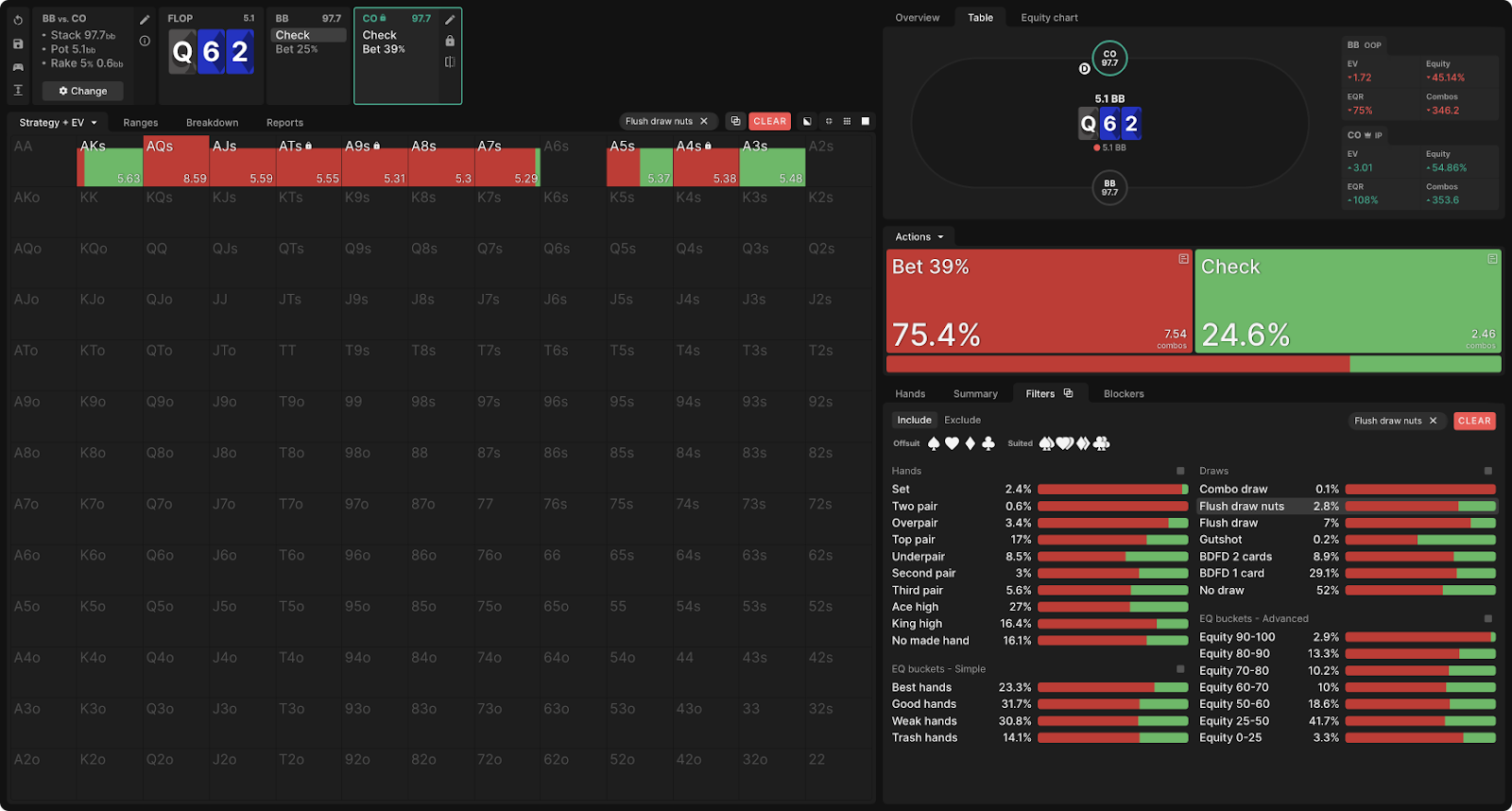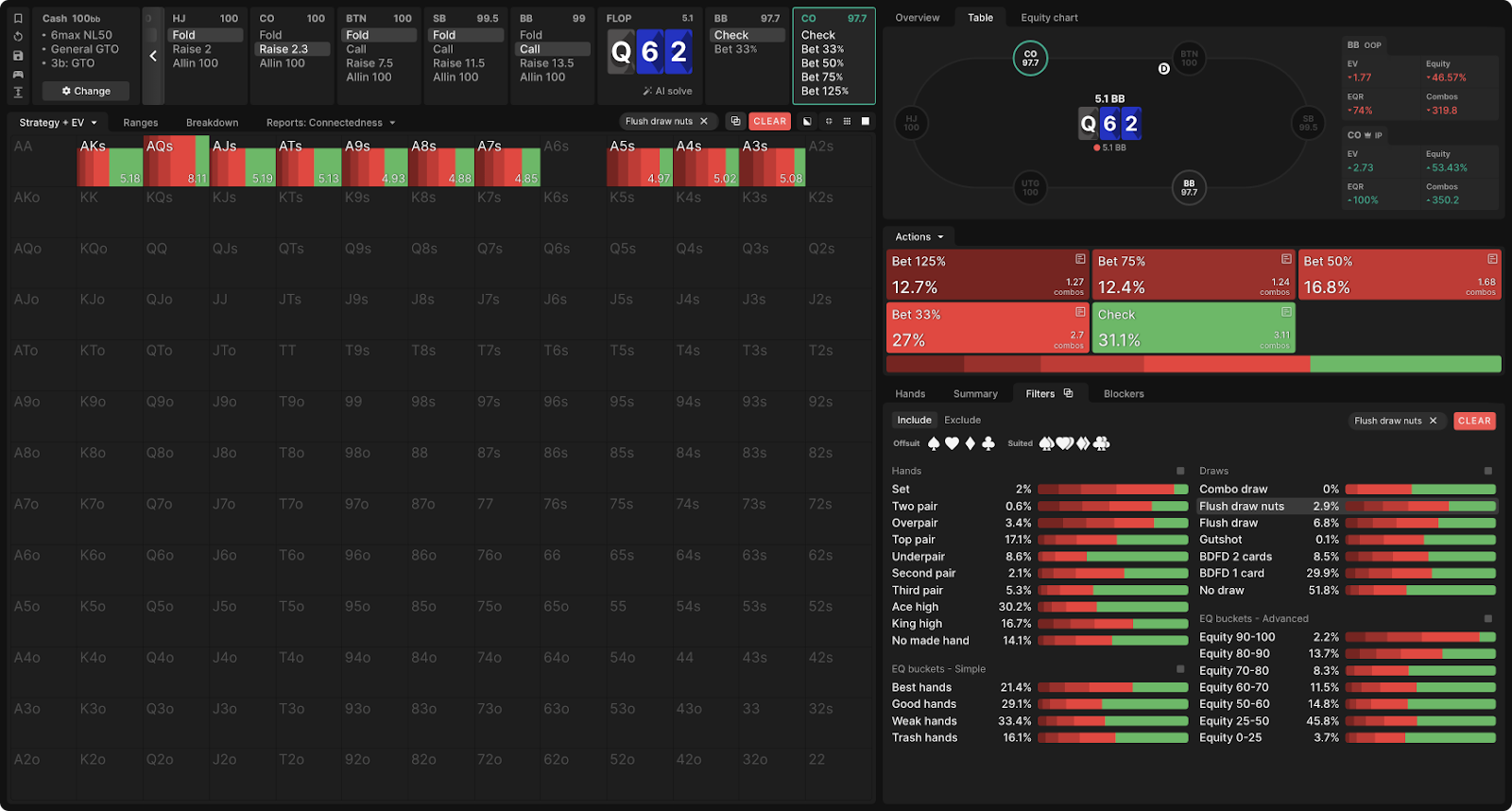 Этот принцип применим к любому флопу, где у CO есть значительный диапазон чеков. Я выбрал флоп Q62 специально, так как на этой доске у CO нет флеш-дро, которые были бы одновременно и комбо-дро. А вот на доске типа QT2 фильтр для натсовых флеш-дро не включал бы руки типа и