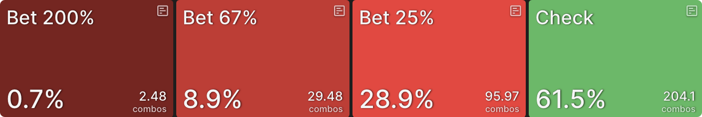Солвер выбирает ставку для некоторых комбинаций по ряду причин, но кроме руки (которая также является топ-парой), эти причины не особенно значимы. Какая-то комбинация может чуть меньше блокировать фолды BB или иметь немного больше аутов на пару. При наличии вычислительных мощностей, солвер использует эти мелкие отличия, чтобы определять, какие комбинации ставить, а какие чекать. Однако это лишь незначительные различия, и метод выбора ставок для каждой руки не так важен.