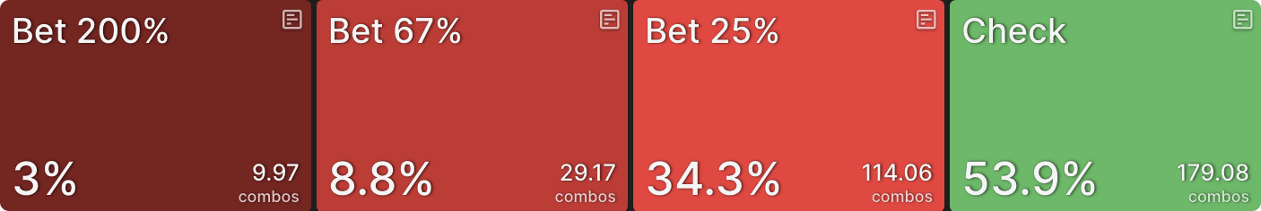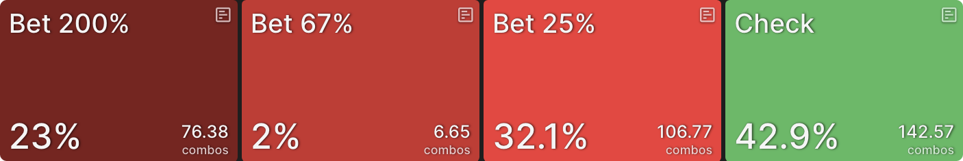 Мы не можем запускать отчеты при кастомных решениях, но можем выбрать, например, бубну и сравнить стратегии, чтобы увидеть, что изменится из-за более частых ставок CO с флеш-дро на флопе. Мы также изменим параметры нашего кастомного решения, поскольку предполагается, что овербеты будут более важной частью стратегии BB, когда у CO капается диапазон. Вместо автоматического определения размеров ставок я задал фиксированные варианты ставок для обоих игроков: 25%, 67% и 200% банка на терне и ривере.