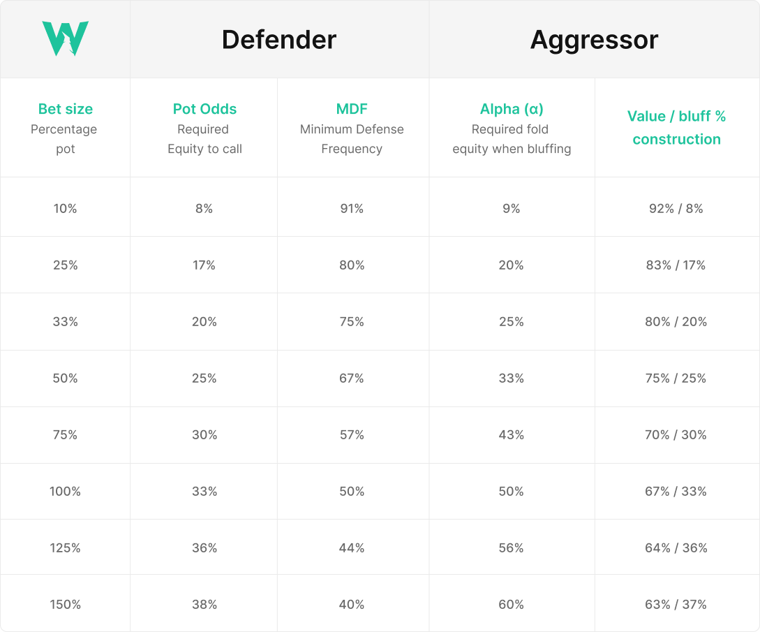 Важное уточнение: эти числа действительны только для начальной ставки! MDF и Альфа изменяются при рейзе и не могут быть определены только с помощью размера ставки в процентах от банка.