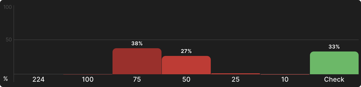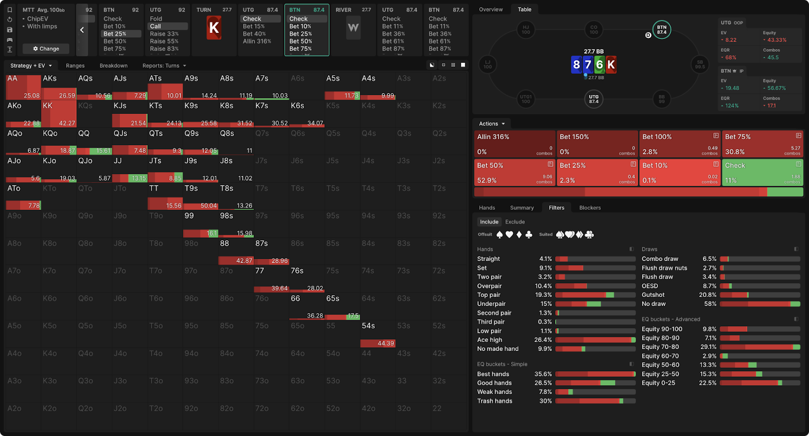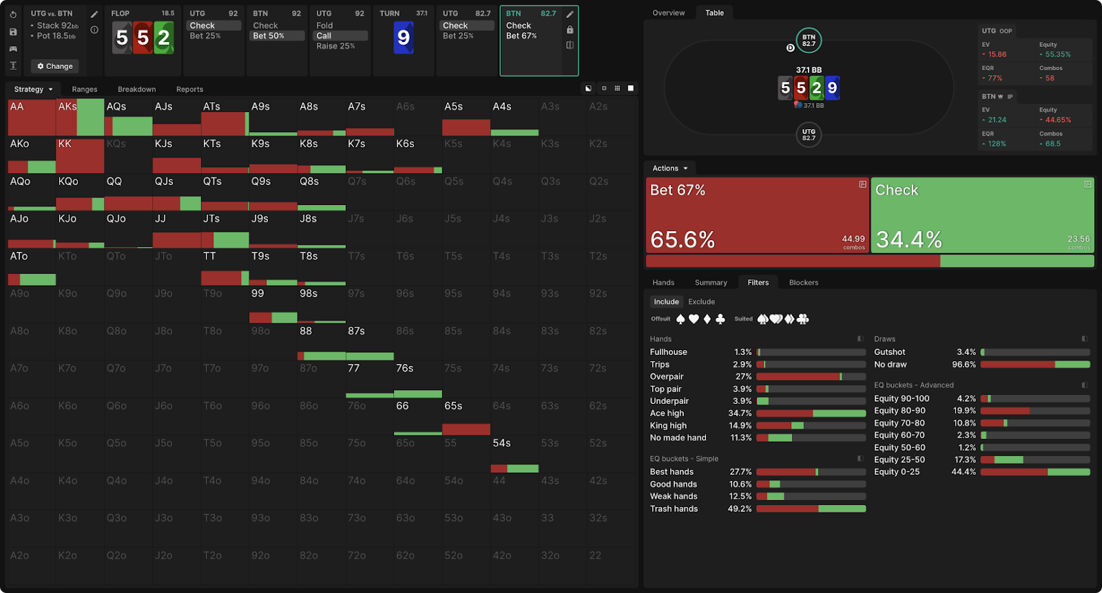 Солвер предполагает сочетание ставок 50% и 75% банка на большинстве тернов, ставя пуш на ривере, который немного больше или немного меньше ставки на терне. Используя функцию «Пользовательские решения», которая включает автоматический выбор оптимального размера ставки, ИИ солвера останавливается на 67% банка как на оптимальном размере на обычном терне,