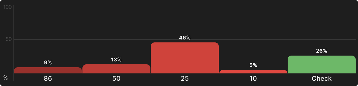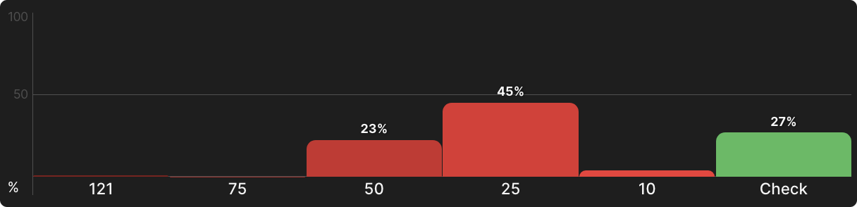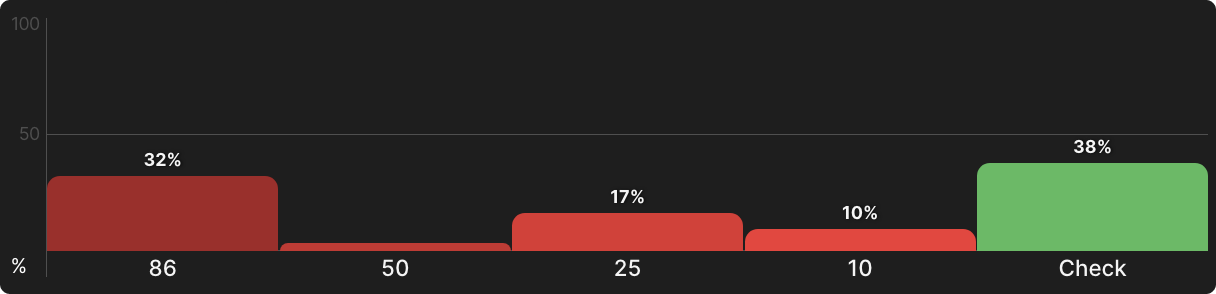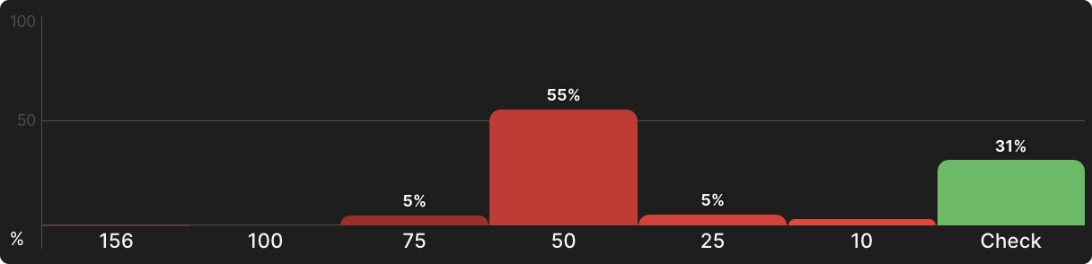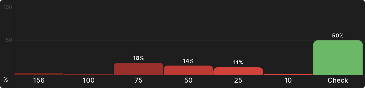 Но большинство риверов не будут овер-картами, и даже если и будут, ваша рука все еще может быть достаточно хороша, чтобы пушить на велью. Так или иначе, так рассчитал солвер. На самом деле не так уж и вероятно, что у вашего оппонента будет король или дама после колла ставок на флопе и терне, и с таким небольшим отставанием для него не так уж и нужно сбрасывать более низкие пары. Туз — это другая история, при этом вам на самом деле следует сделать чек в ответ. К счастью, позиция дает вам возможность сделать это.