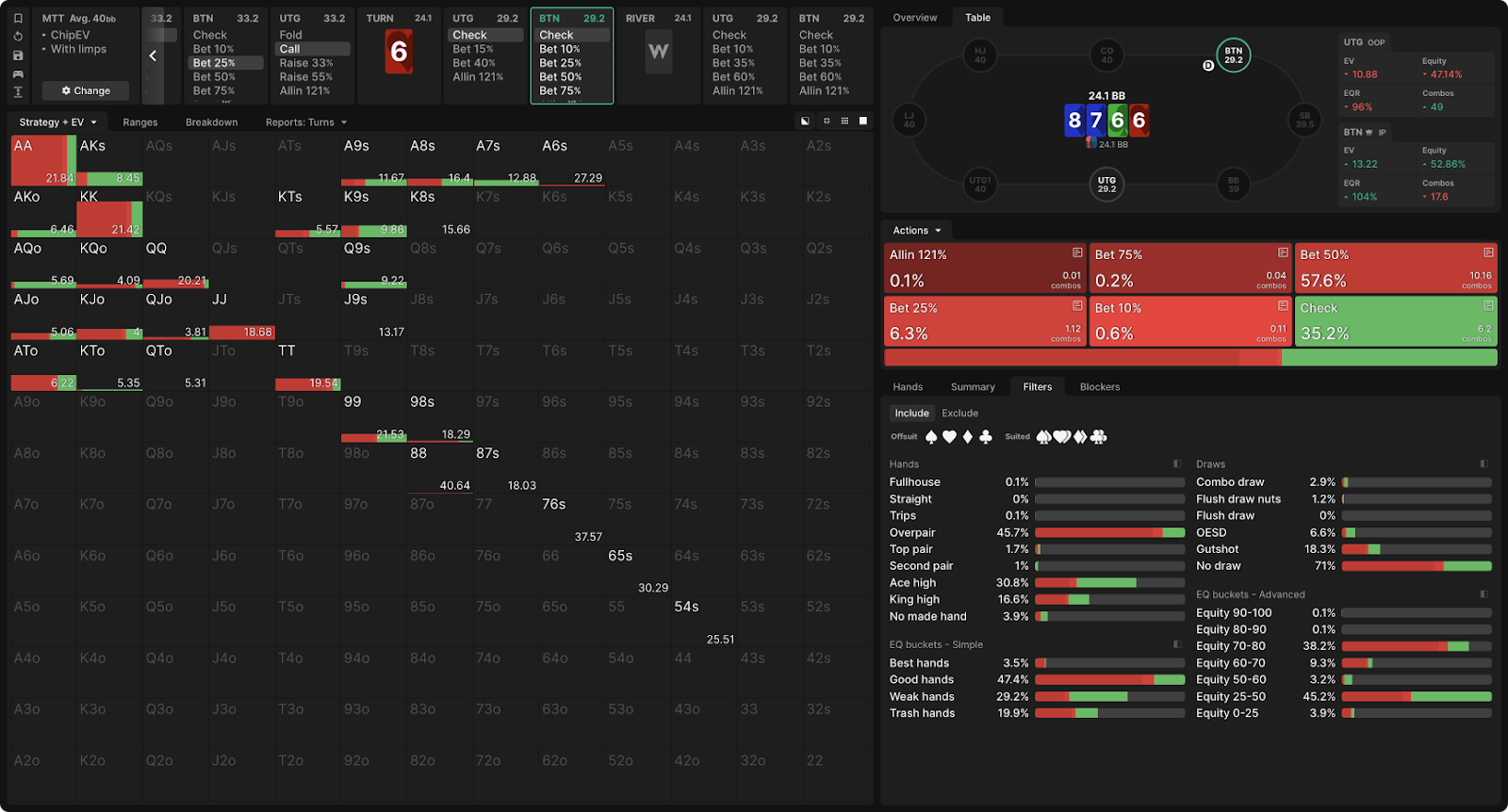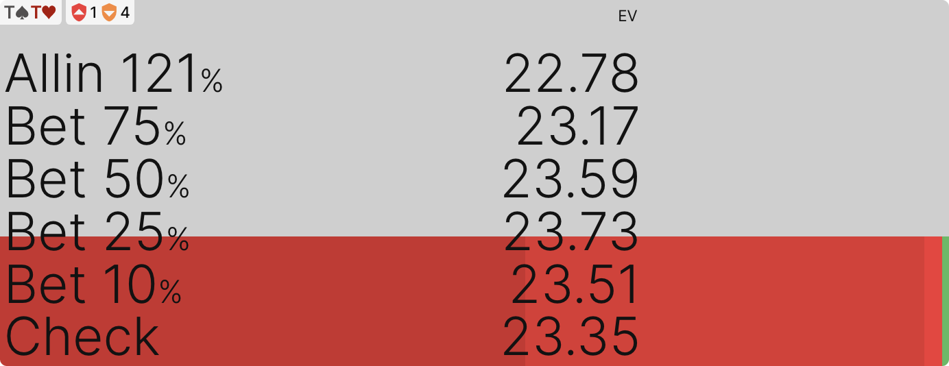 Это наиболее понятно с такими руками, как TT или JJ, которые довольно сильны, но теряют много эквити на риверах с овер-картами. В целом, в равновесной chip EV модели пуш с TT составляет 22,78bb на терне по сравнению с 23,73bb при ставке в 25% банка, так что это не большая ошибка.