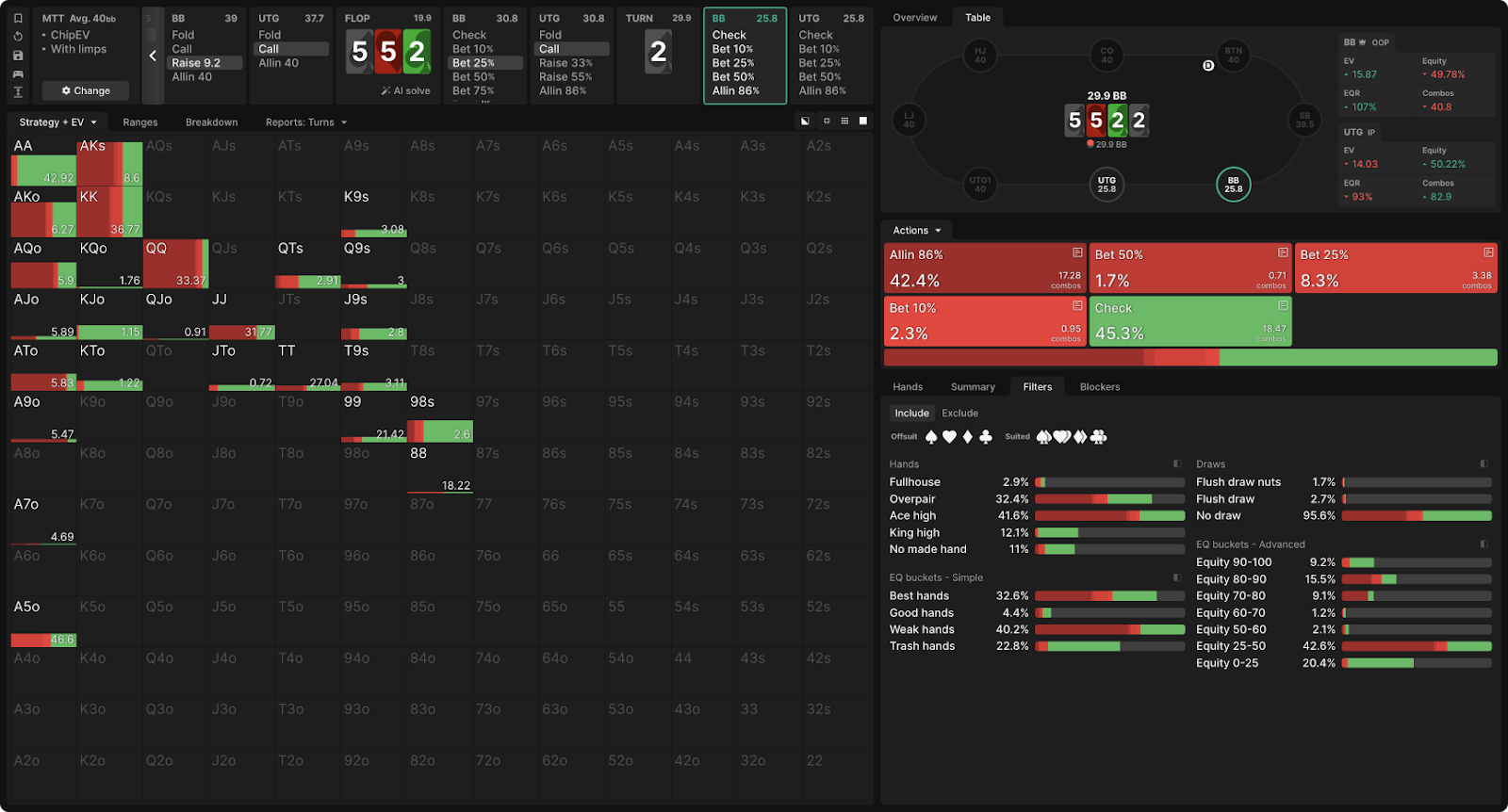 Возвращаемся к глубине в 40bb. Мы видим, что на этой более динамичной доске игрок, делающий 3-бет без позиции (BB), в основном отказывается от геометрических ставок по 3 улицам и играет по стратегии пуш-или-чек, когда стеки позволяют.