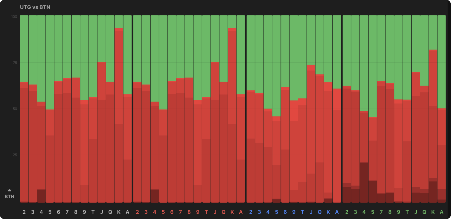 Вот стратегия BTN на всех картах терна (сгруппированных по рангу) со стартовыми стеками 100bb в 3-бет банке против UTG после того, как продолженная ставка на флопе на в размере 50% банка была заколлирована: